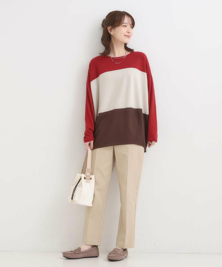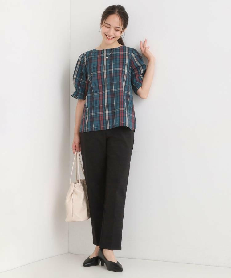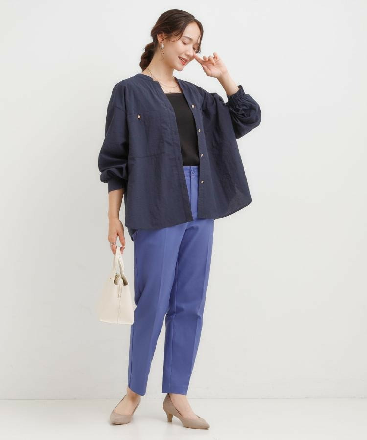 すっきりと見えるシルエットなので、きれいめなブラウスやカットソーを合わせてきちんと感あるオフィススタイルに。