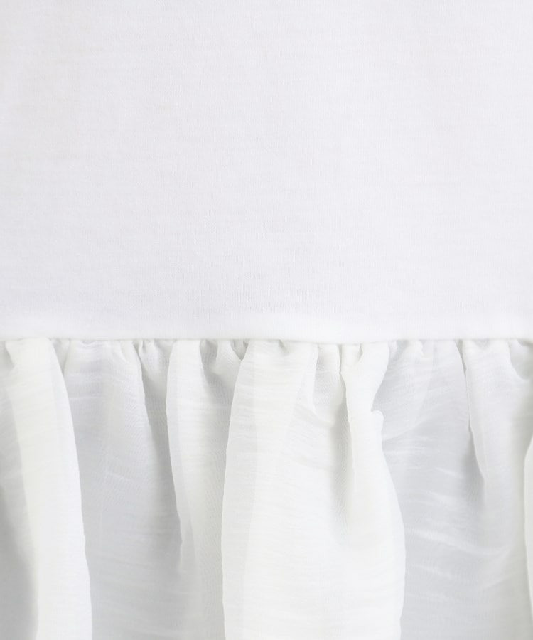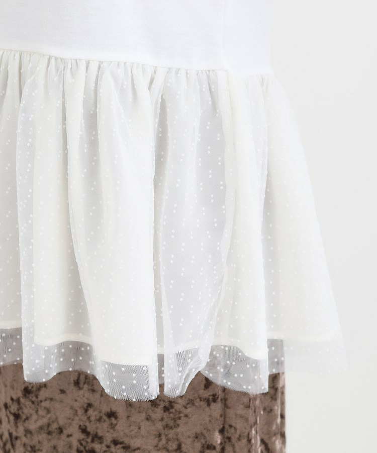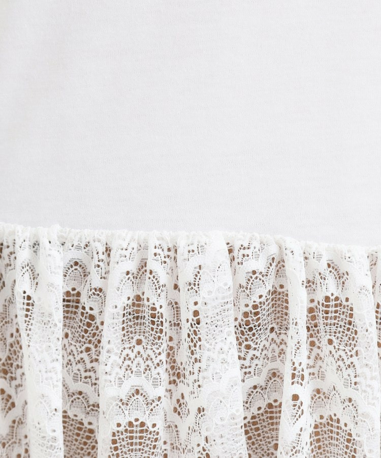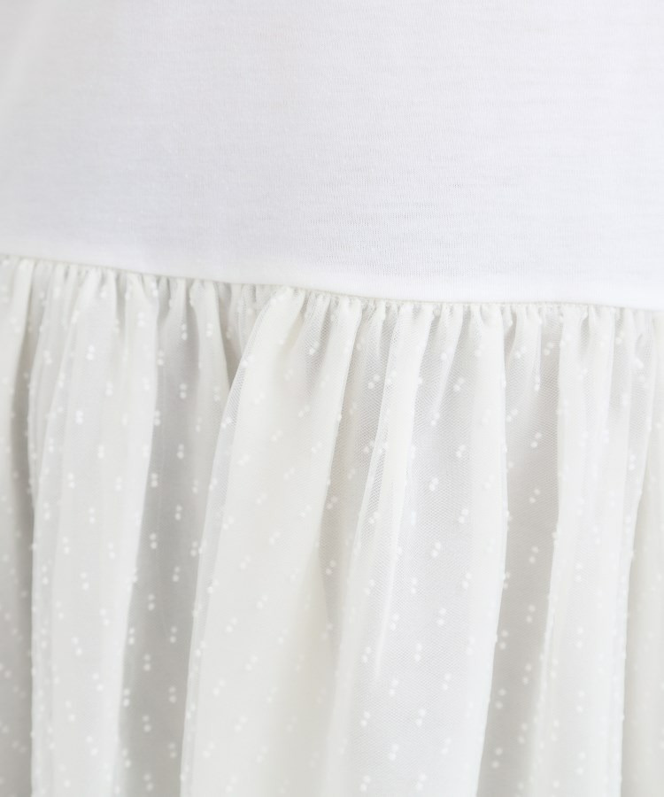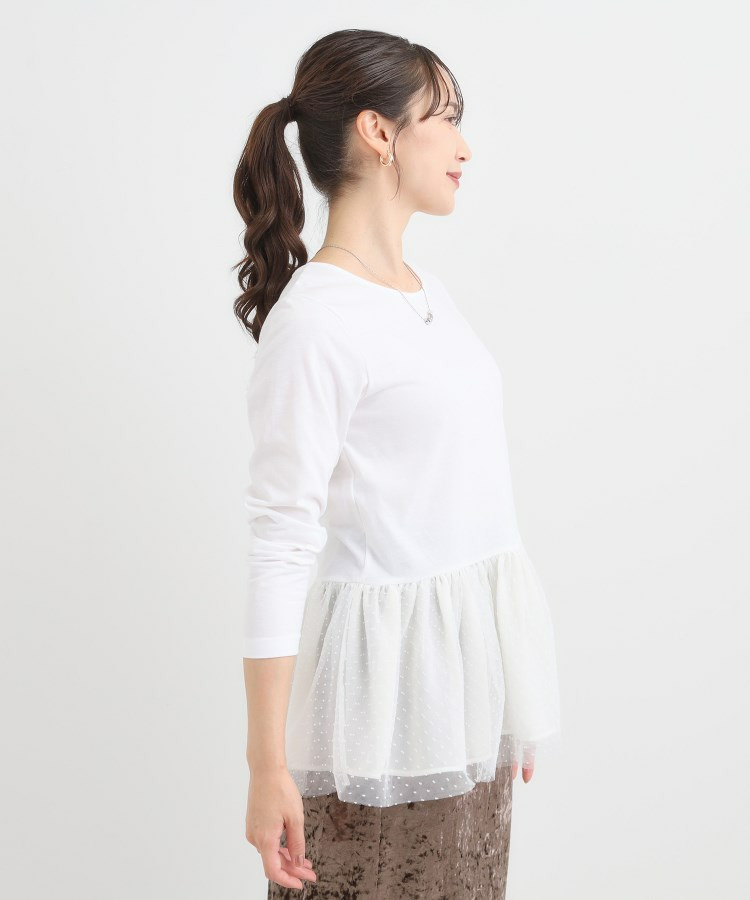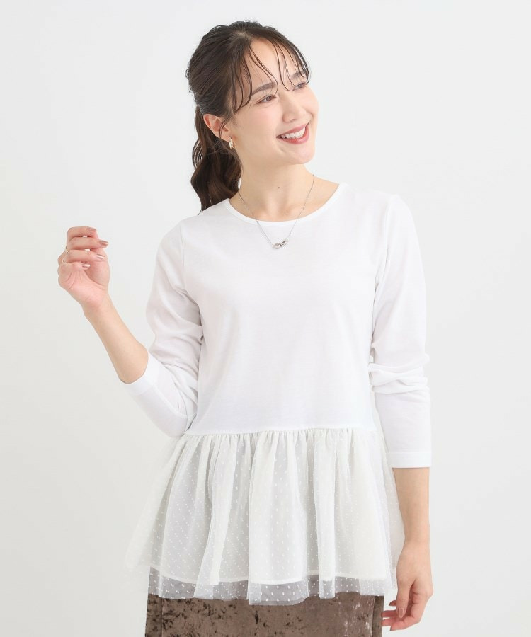 裾にドットチュール、光沢があるシフォン、レースの素材を使ったデザインでニットやスウェットのインナーに重ねやすい1枚です。