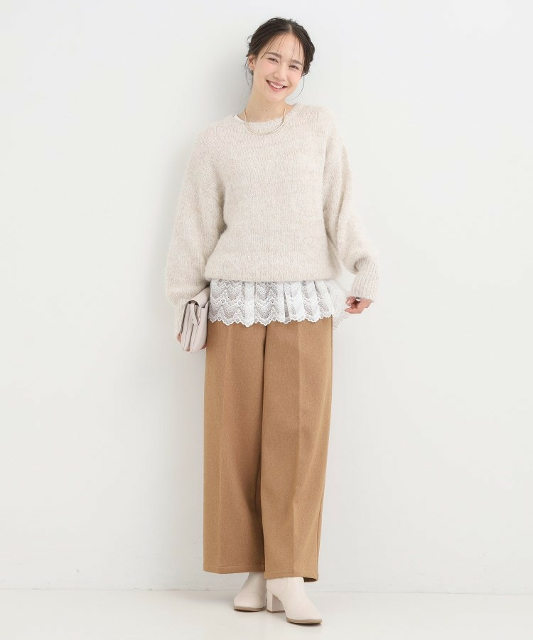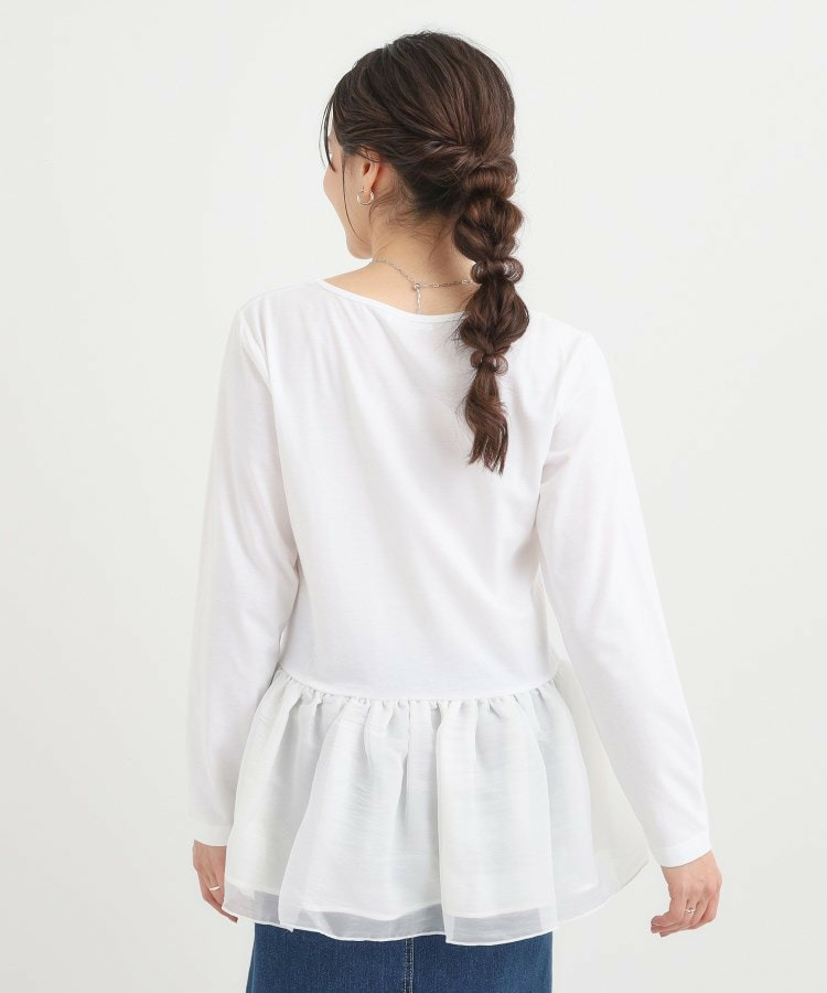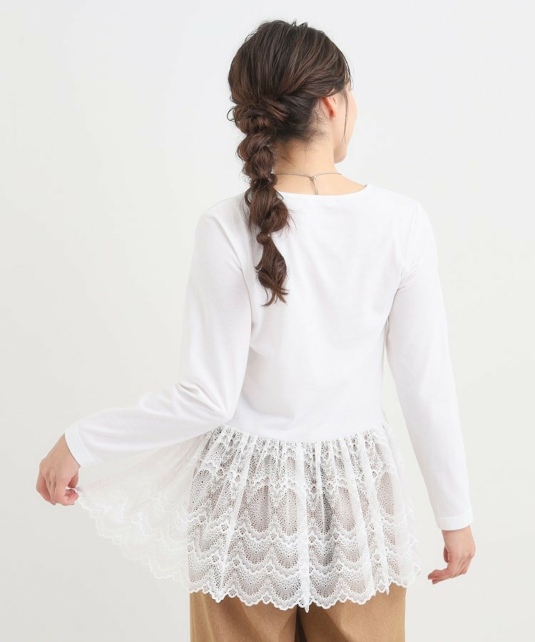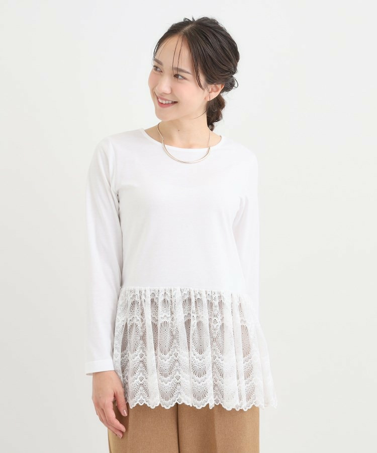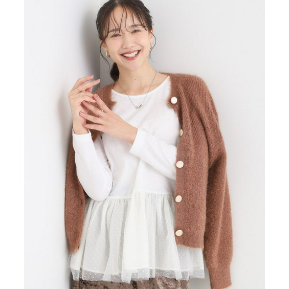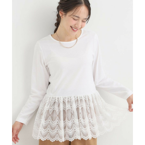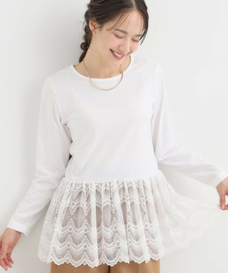 裾にドットチュール、光沢があるシフォン、レースの素材を使ったデザインでニットやスウェットのインナーに重ねやすい1枚です。