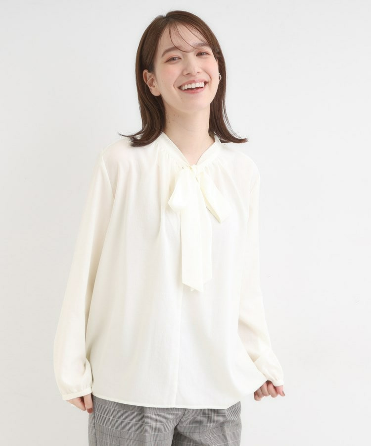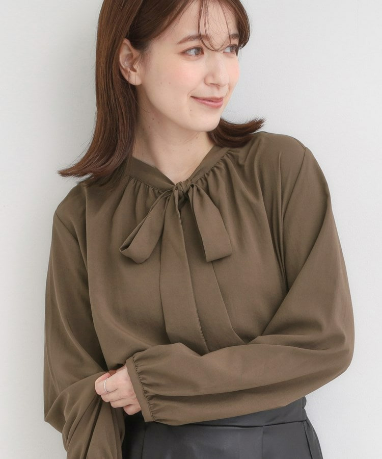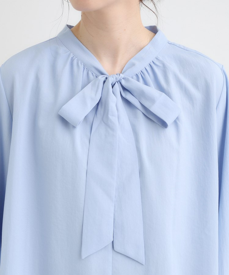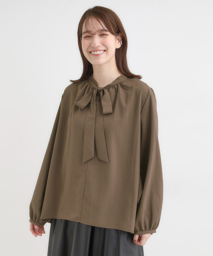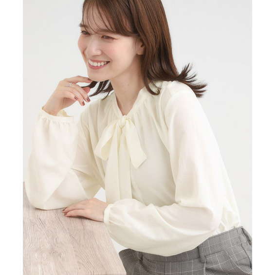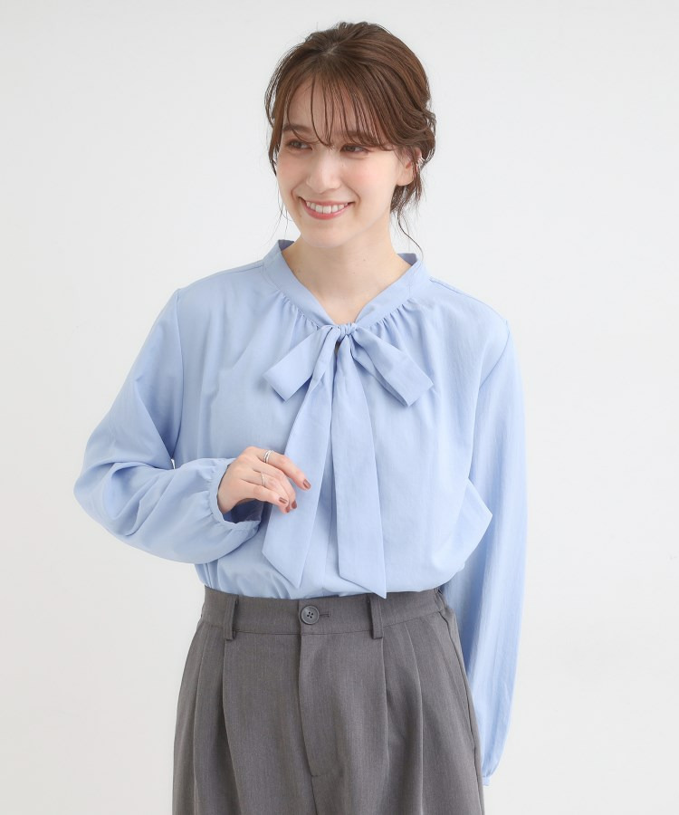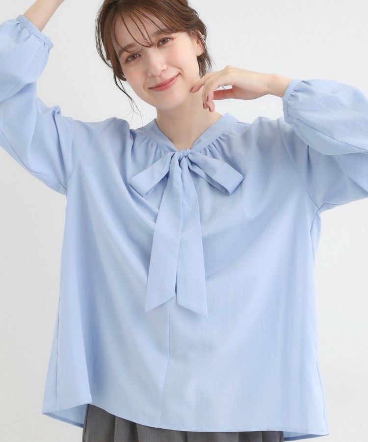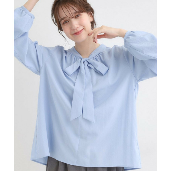フロントにあしらったボウタイが目を引くデザインブラウス。