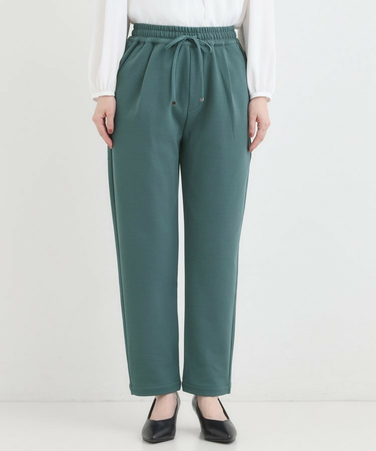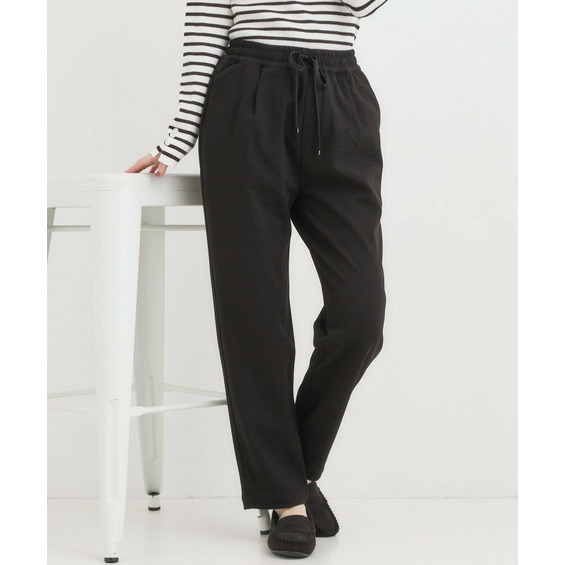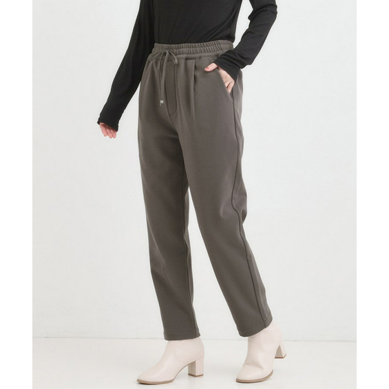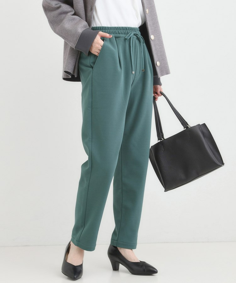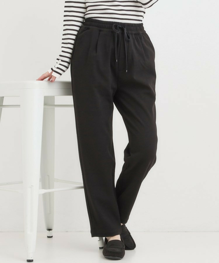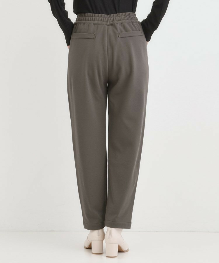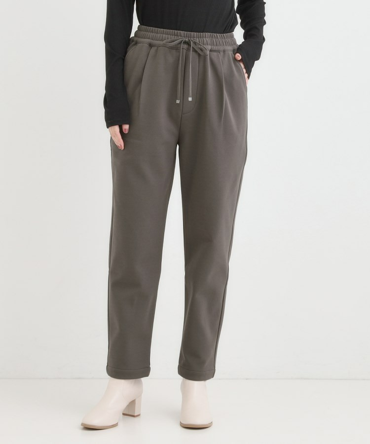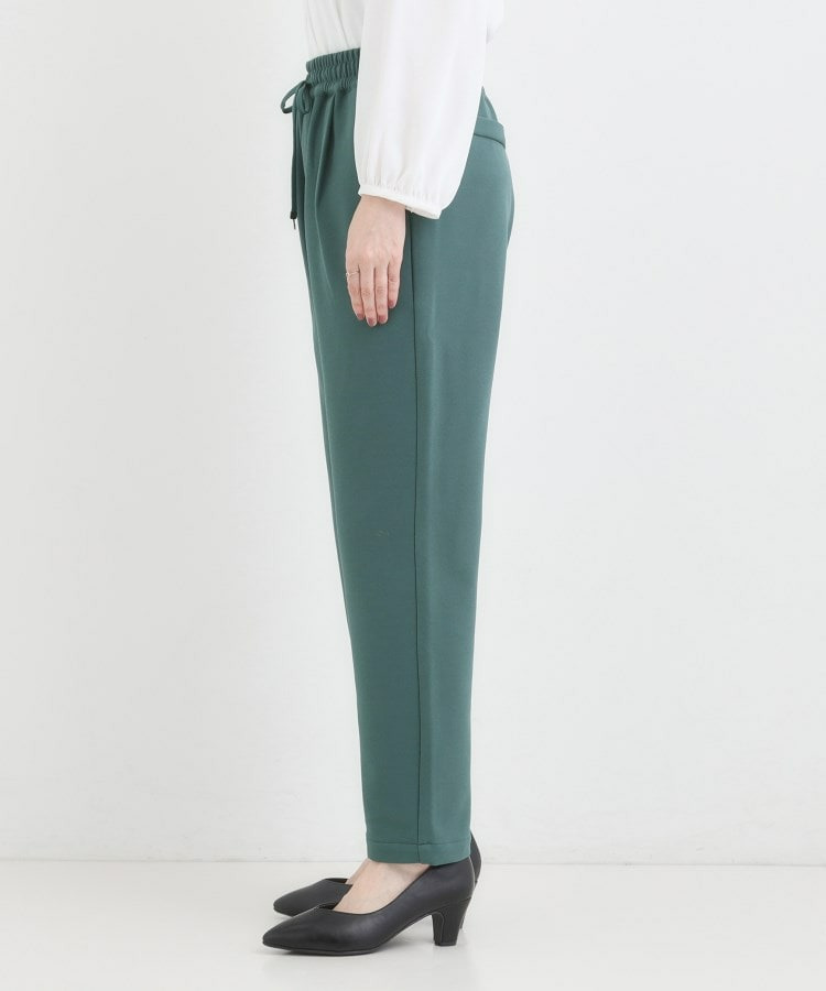腰回りはゆったりとしていて脚のラインを拾いにくく、裾に向かって細くなるテーパードシルエットで、脚全体をすっきりと見せてくれます。