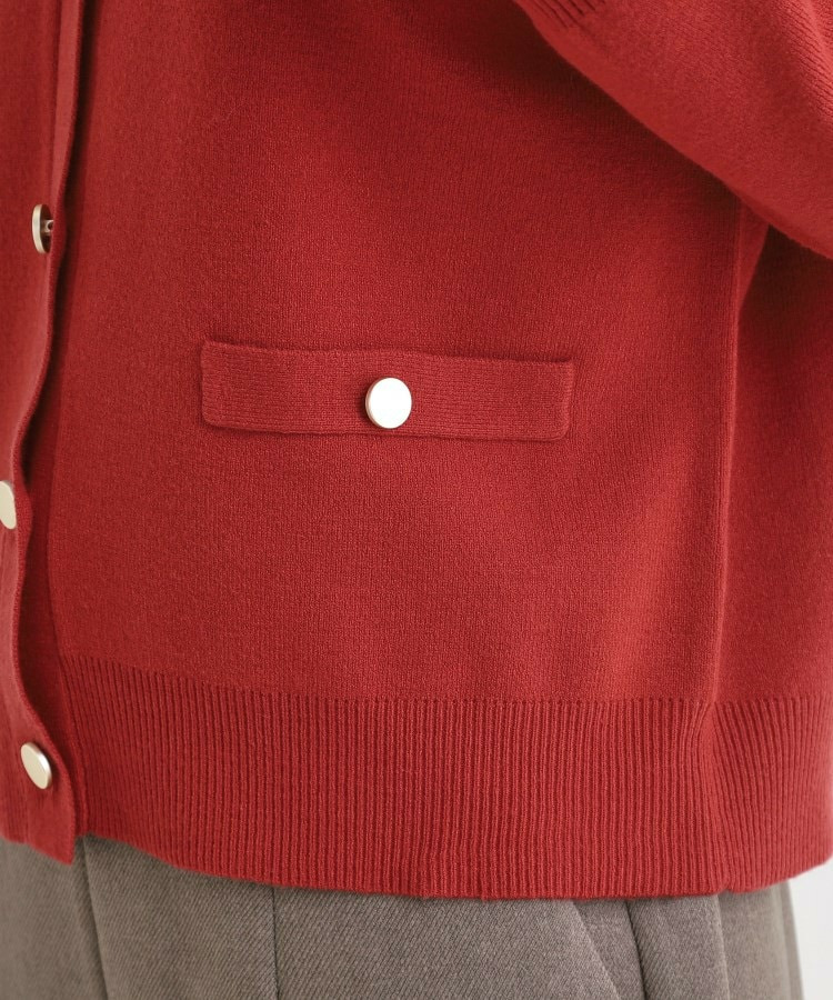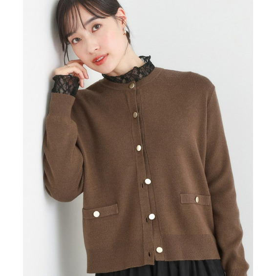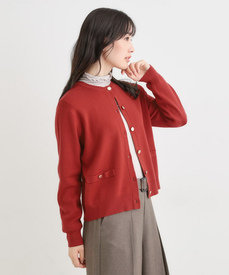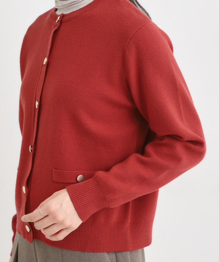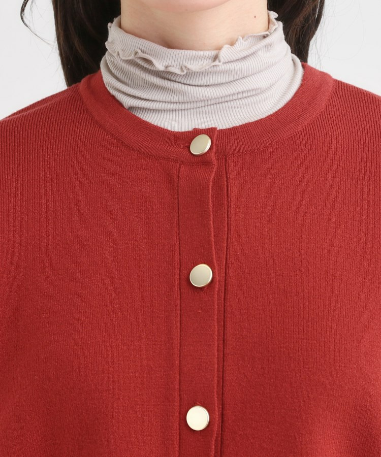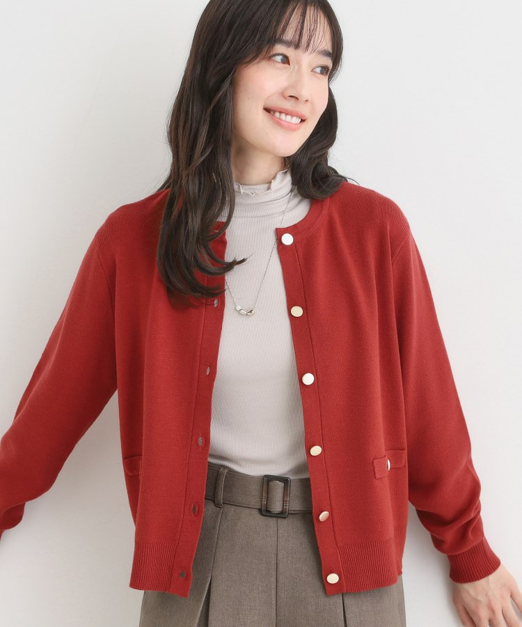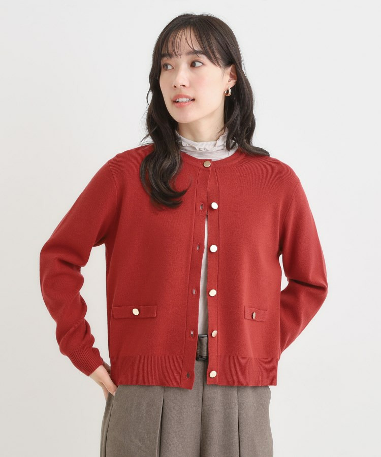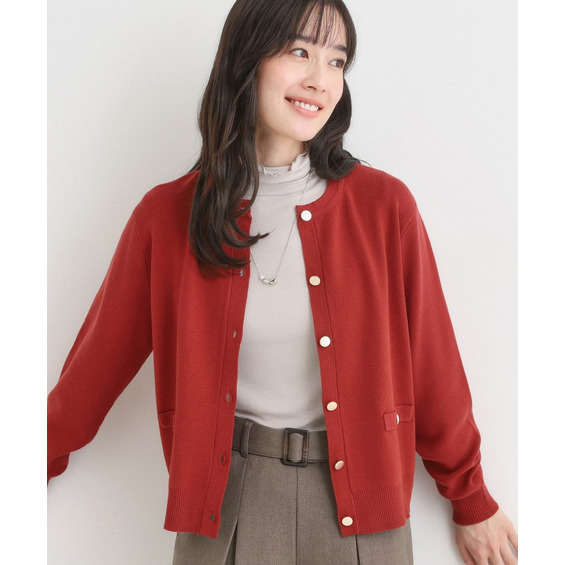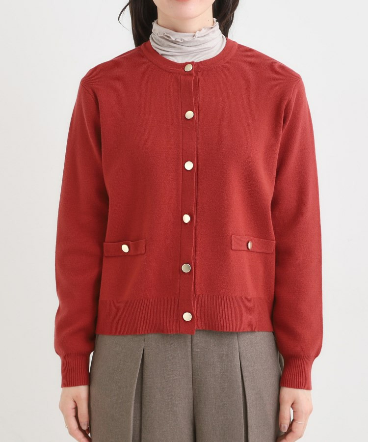 ゴールドのメタルボタンが映えるシンプルなクルーネックカーディガン。
