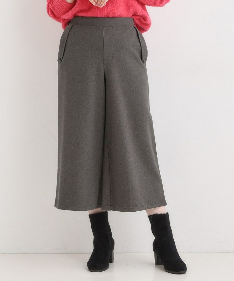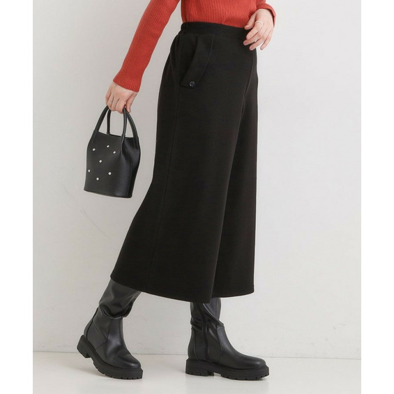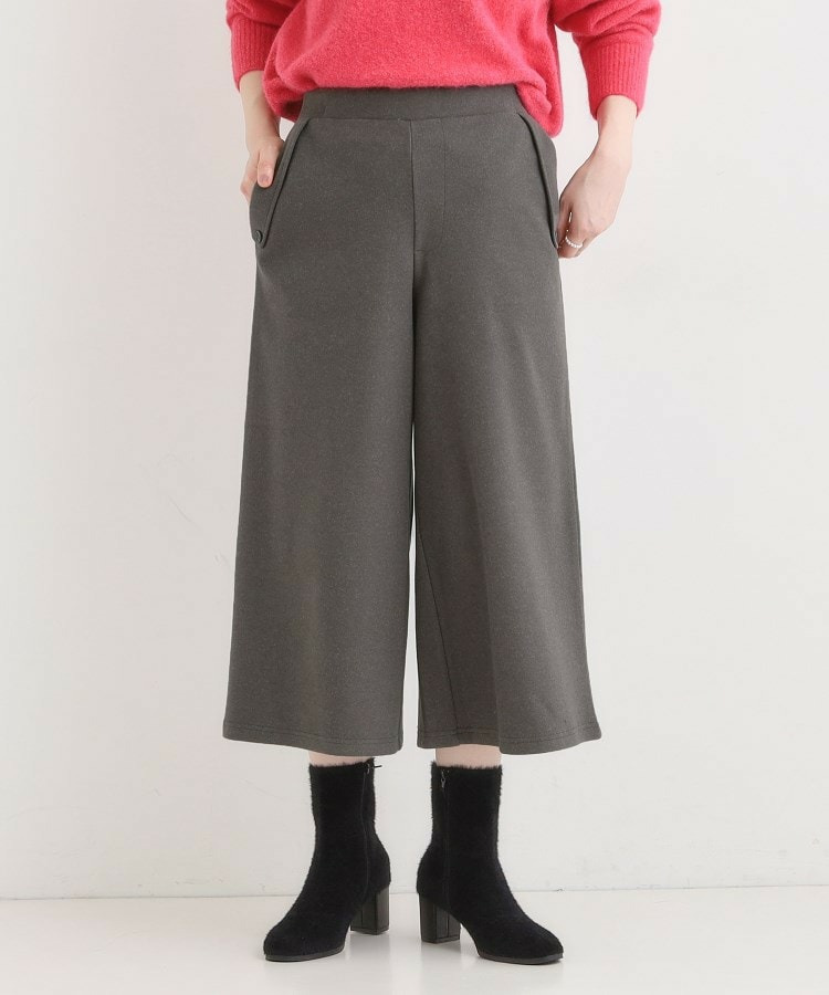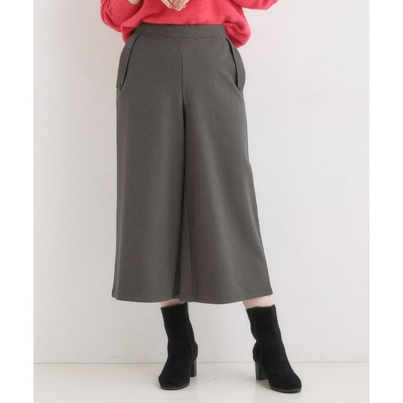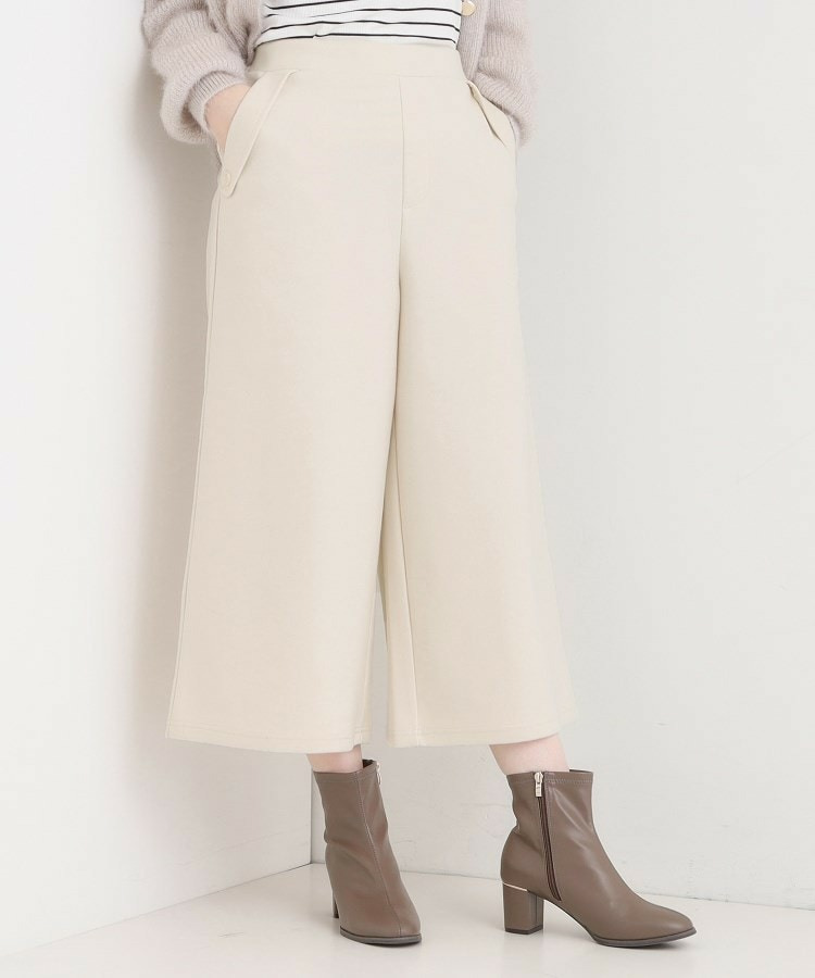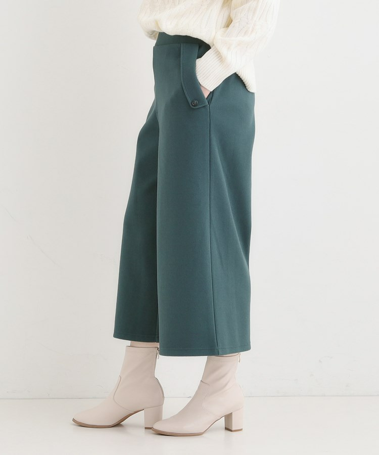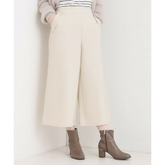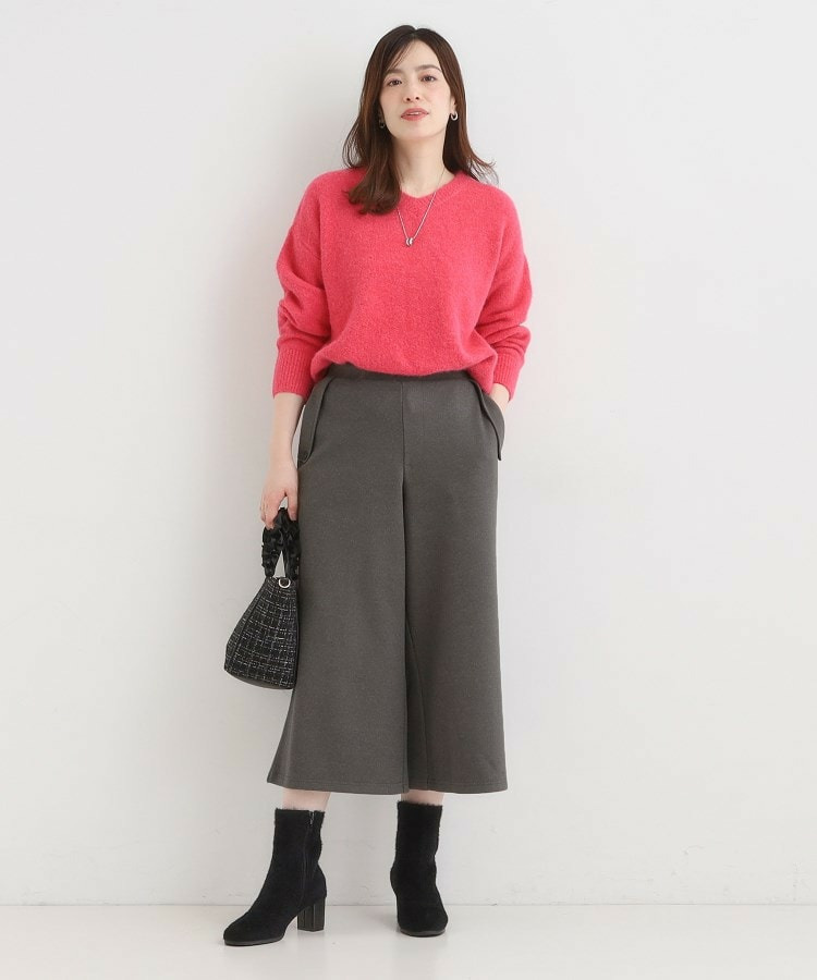 裾に向かってゆるやかに広がるワイドシルエットが気になる下半身をカバーしつつ、クロップド丈が足もとにメリハリを付けてバランス良く着こなせます。