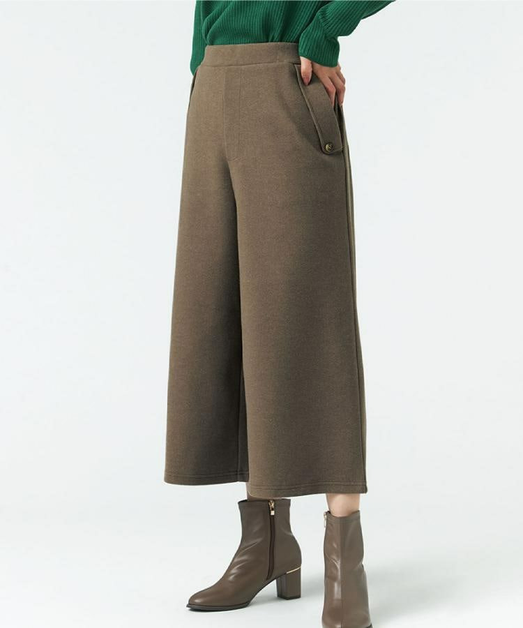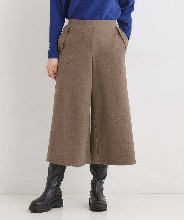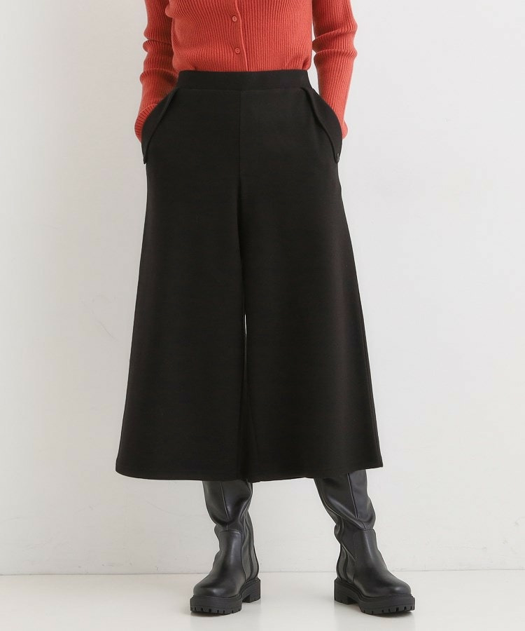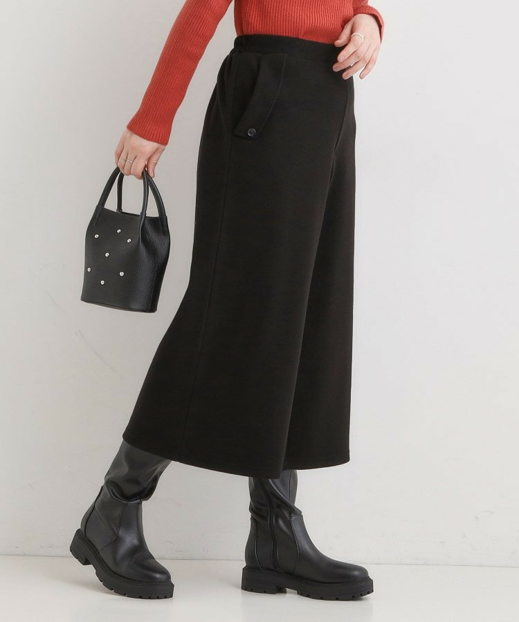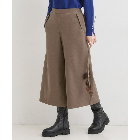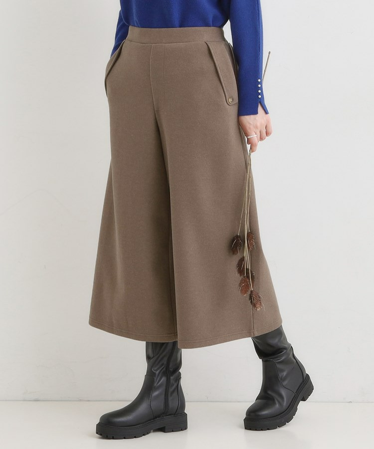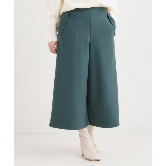 裾に向かってゆるやかに広がるワイドシルエットが気になる下半身をカバーしつつ、クロップド丈が足もとにメリハリを付けてバランス良く着こなせます。