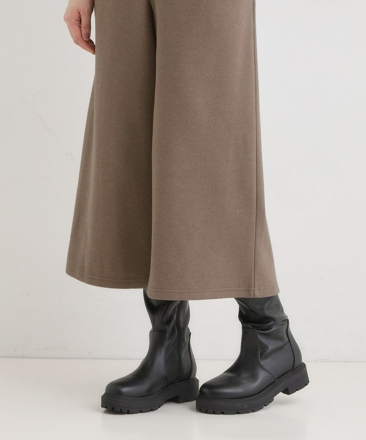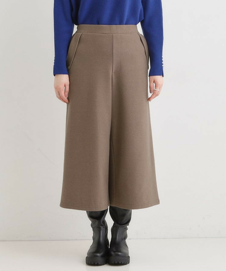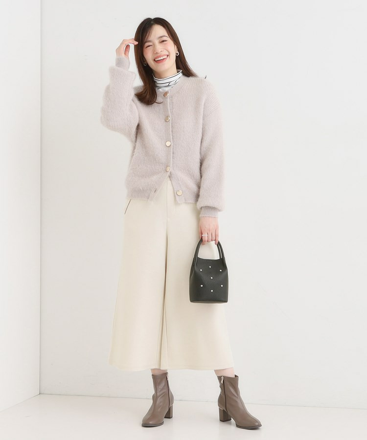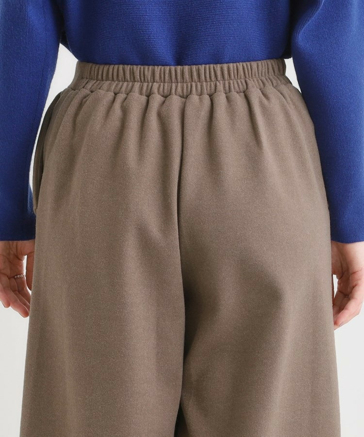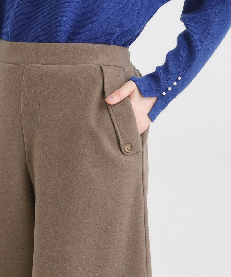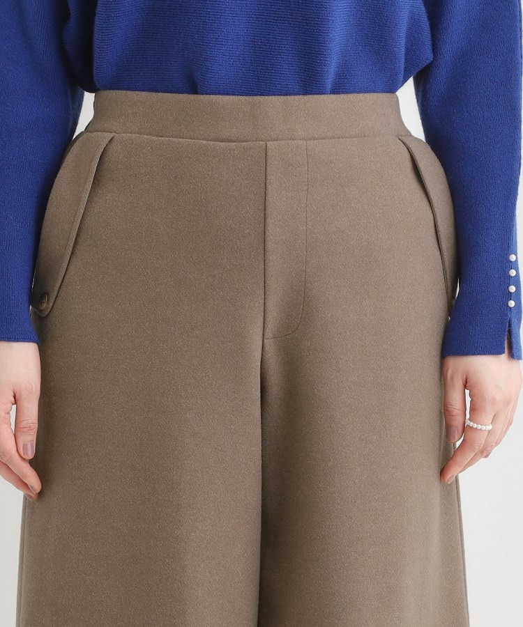 裾に向かってゆるやかに広がるワイドシルエットが気になる下半身をカバーしつつ、クロップド丈が足もとにメリハリを付けてバランス良く着こなせます。