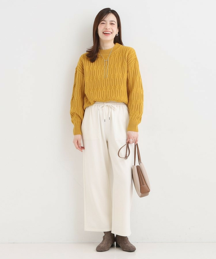 カジュアルシーンなら、スウェットやケーブル柄ニットなど、ざっくり感のあるトップス合わせがおすすめ。