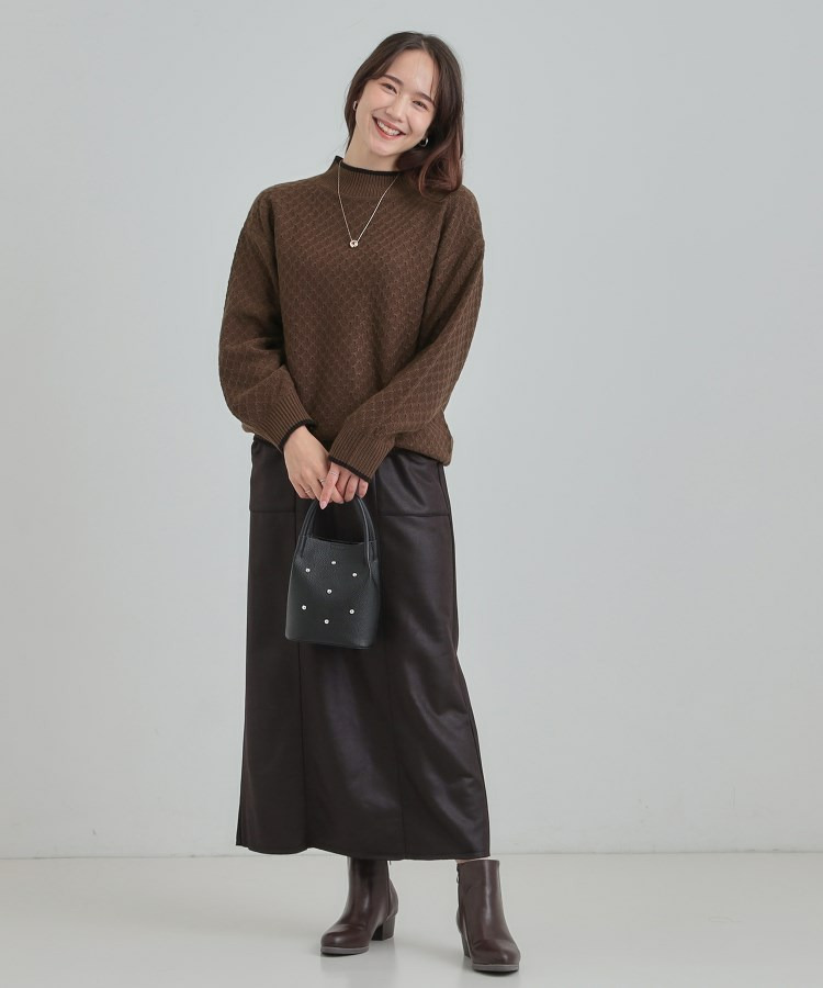 アウトスタイルでは、ナロースカートと合わせていただくと、フェミニンな装いに。