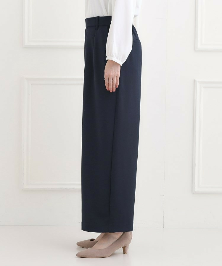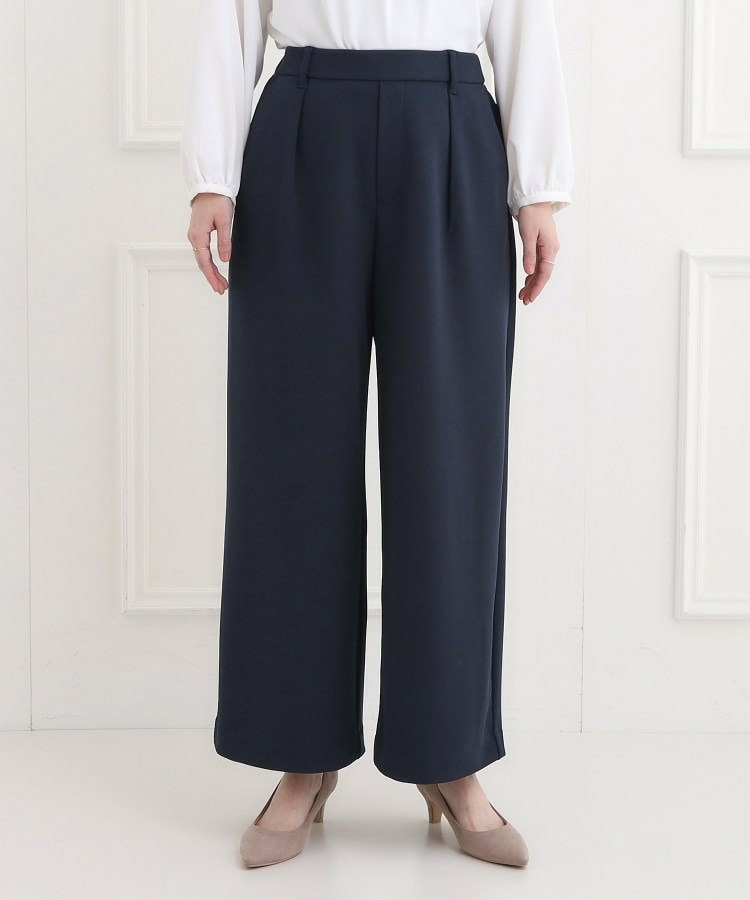 伸縮性に富み、楽な穿き心地のきれいめワイドストレートパンツ。