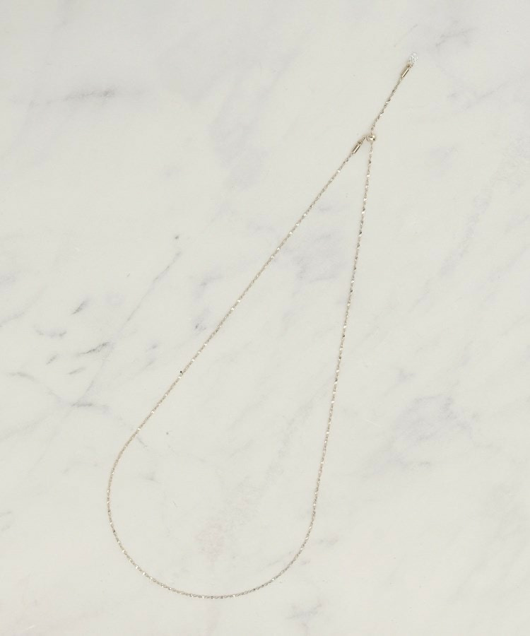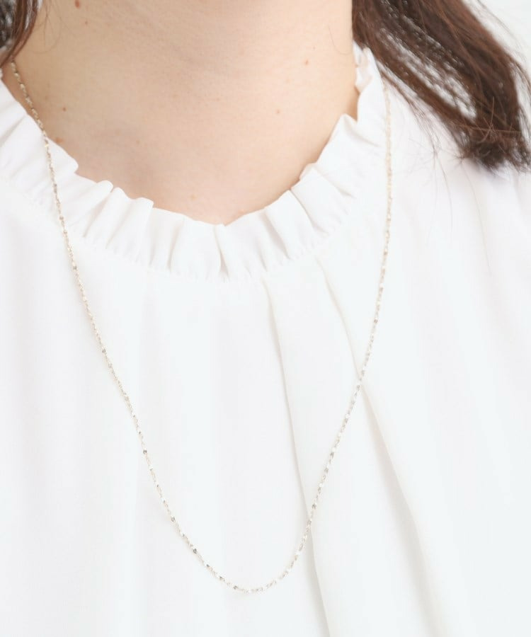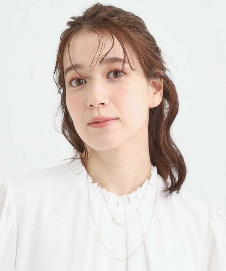 短いネックレスを一重で着用し、長いネックレスを重ねることで、お洒落感をアップ。