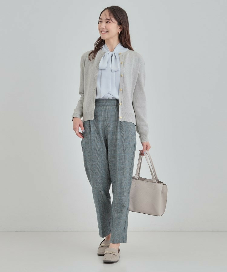 インナーをボウやフリルなどのブラウスにしてテーパードパンツをあわせるとオフィススタイルに。