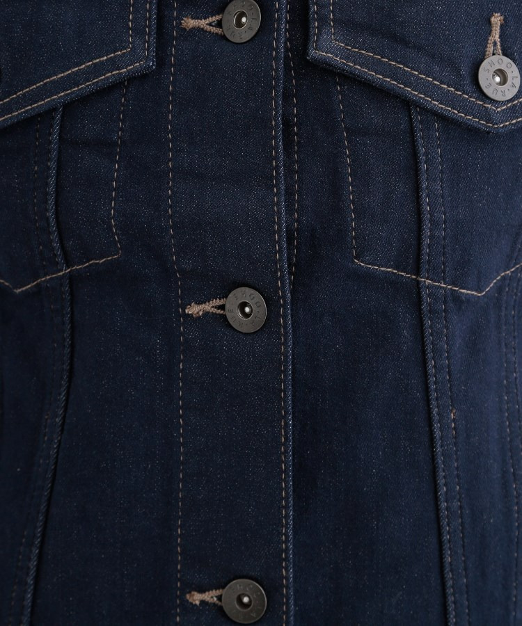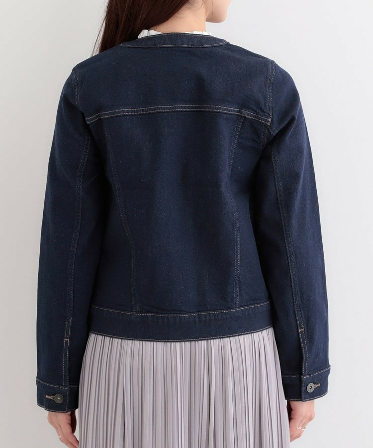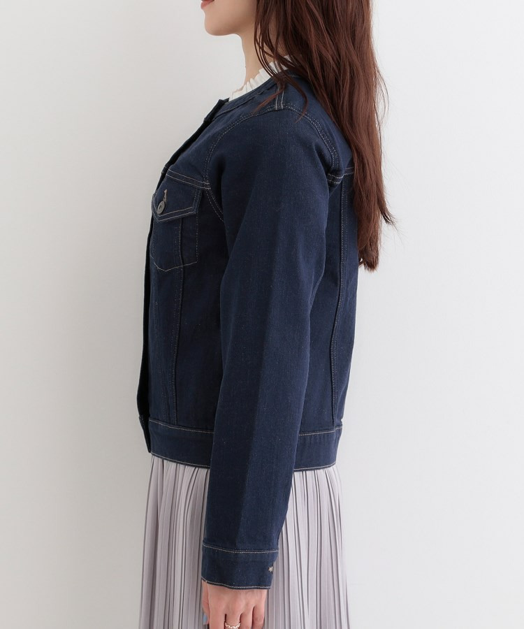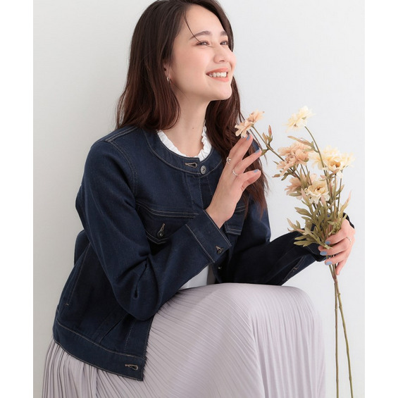 きれいめにも着回しできる、コンパクトサイズのノーカラーデニムジャケット。
