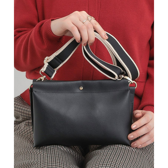 配色のショルダーベルトをポイントにした3層のバッグです。