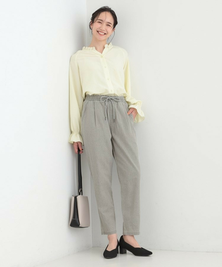 ウエストはカジュアル感のある丸紐を使用し、トップスをインしたときのポイントに。