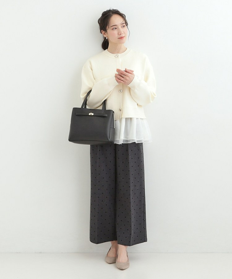 フロントの金具付きのベルトをポイントにして、上品できれいめに仕上げました。