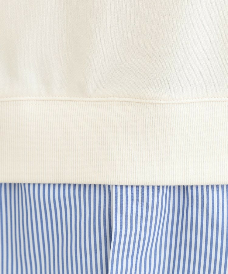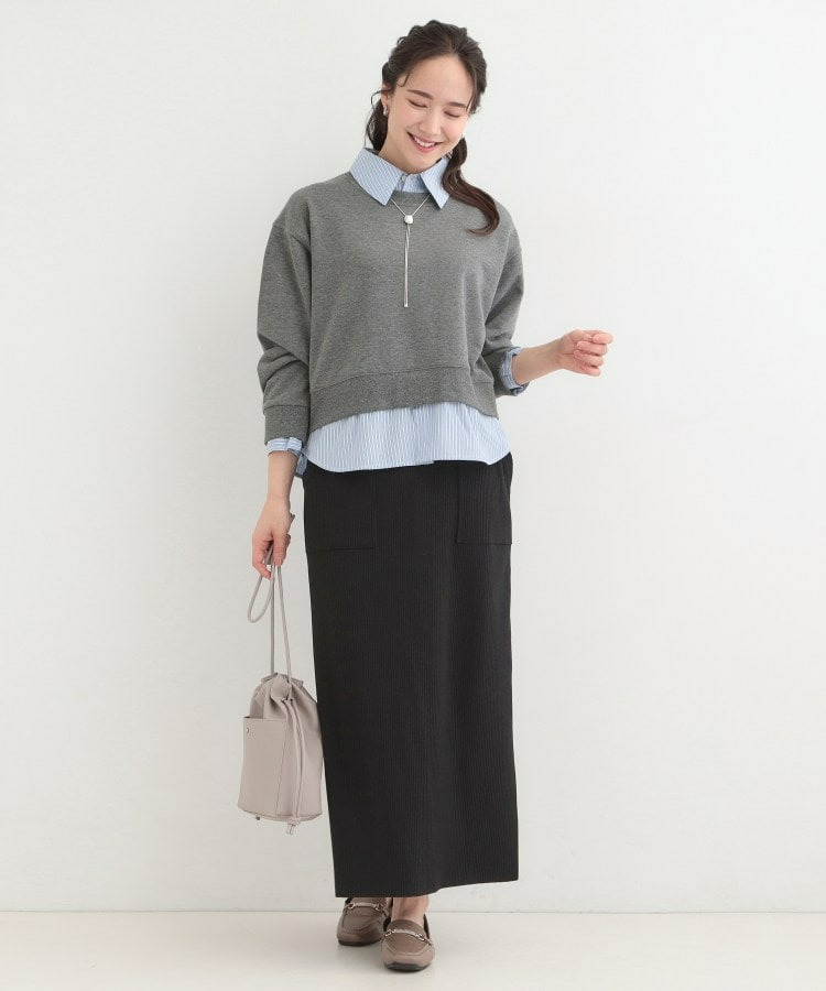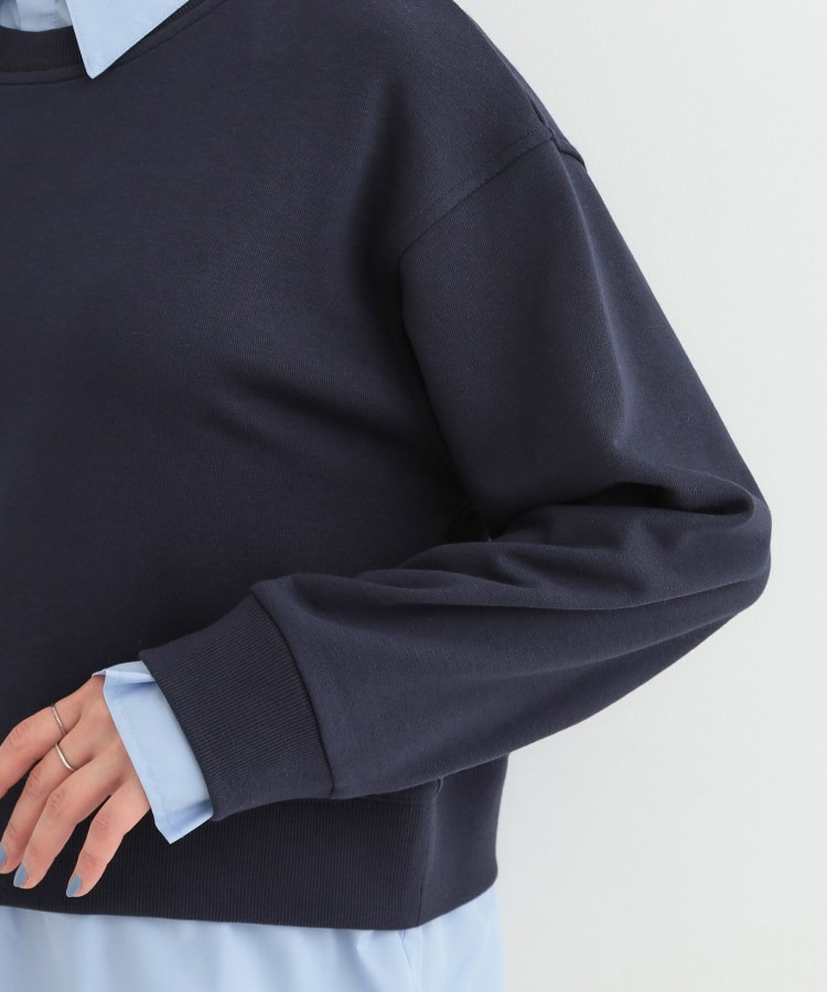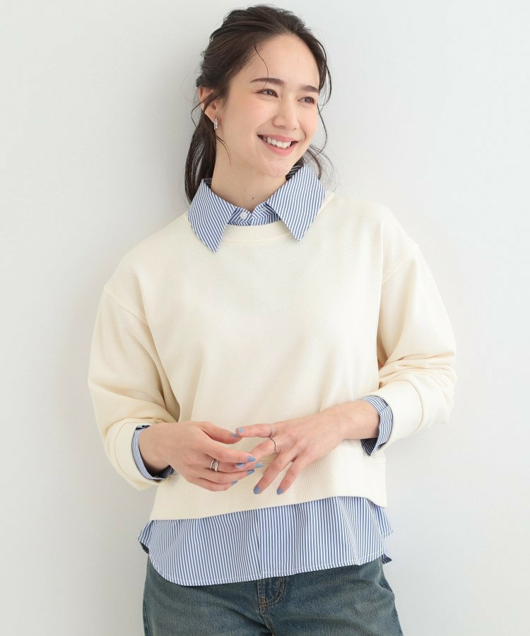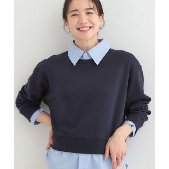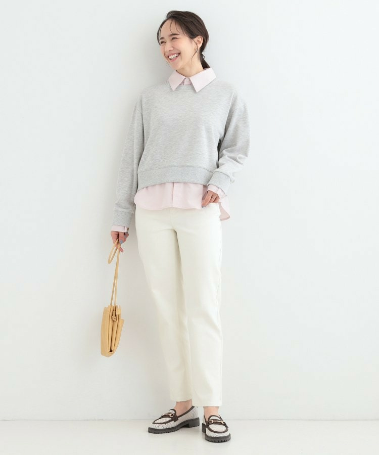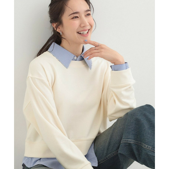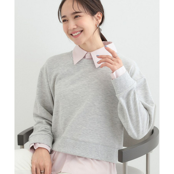 衿元と裾部分のシャツのカラーが、ベーシックカラースウェットの落ち着いた印象に女性らしい柔らかさをプラスしています。