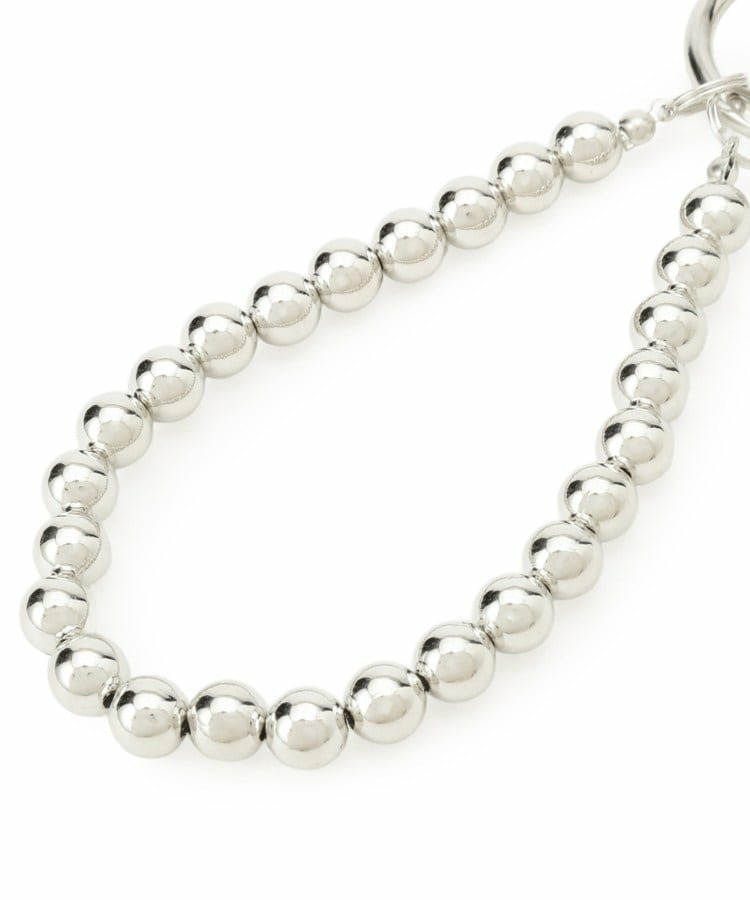 メタリックなビーズを連ねたループストラップに丸リングを配し、取り外し・取り付けが簡単な仕様。