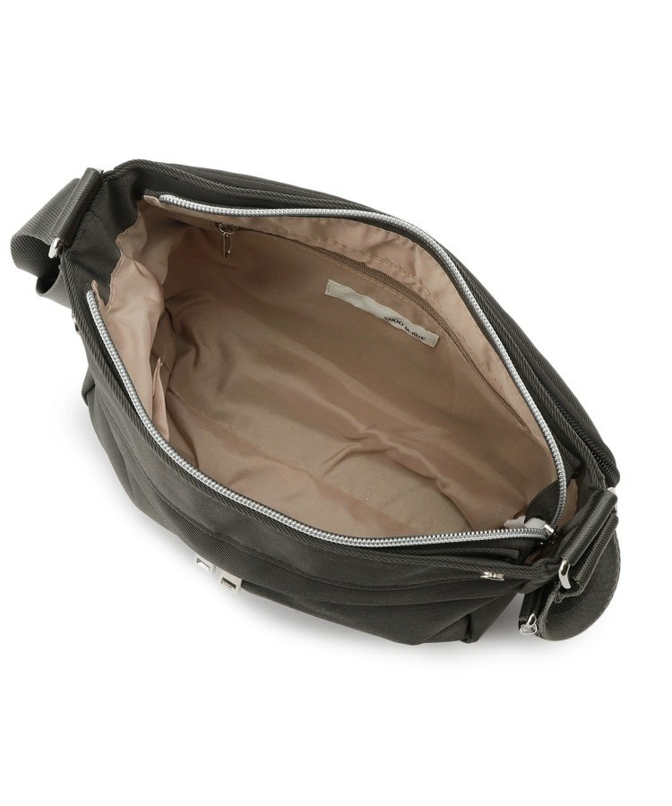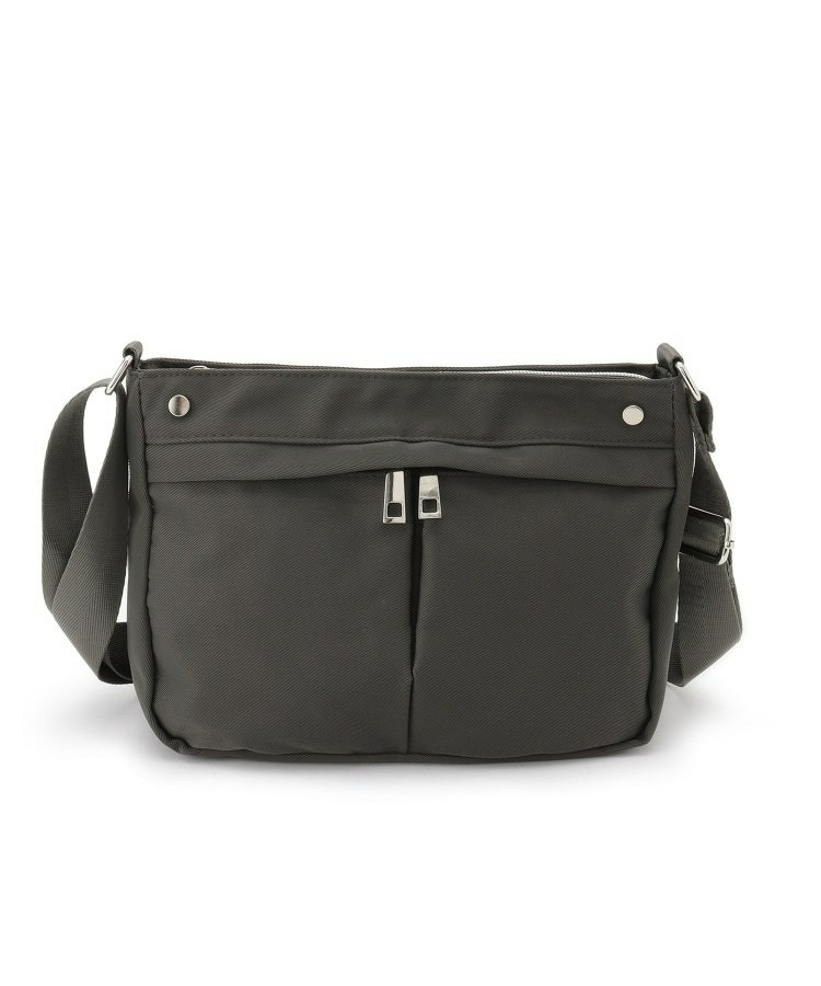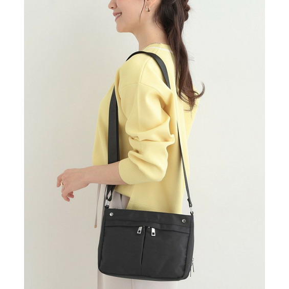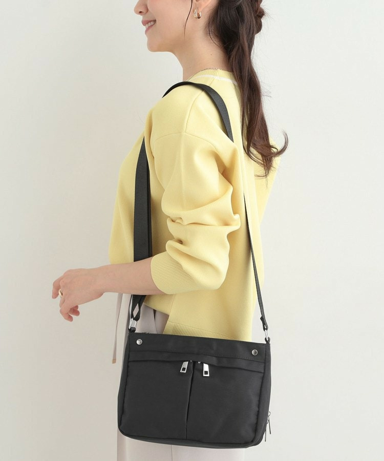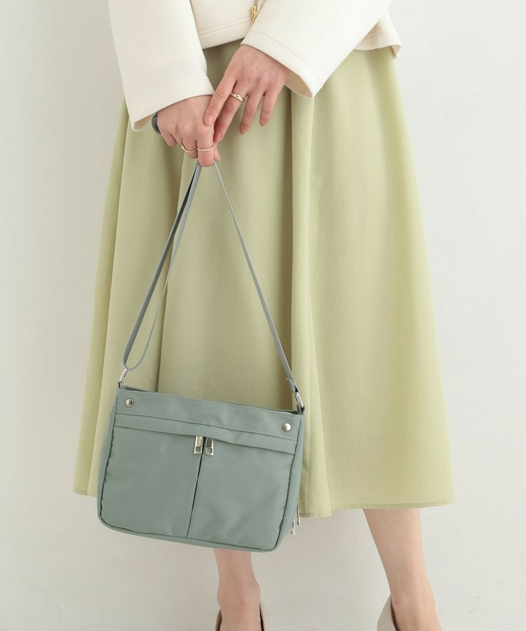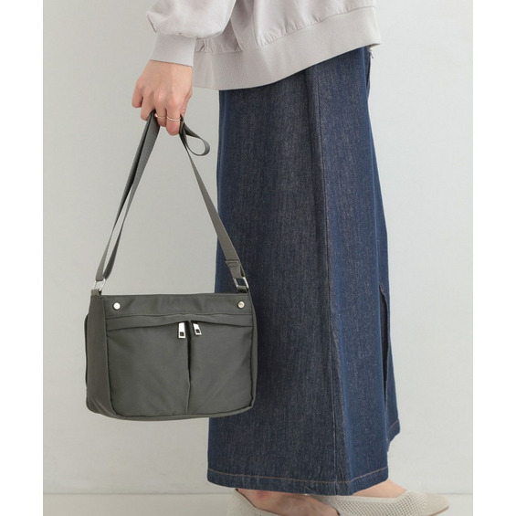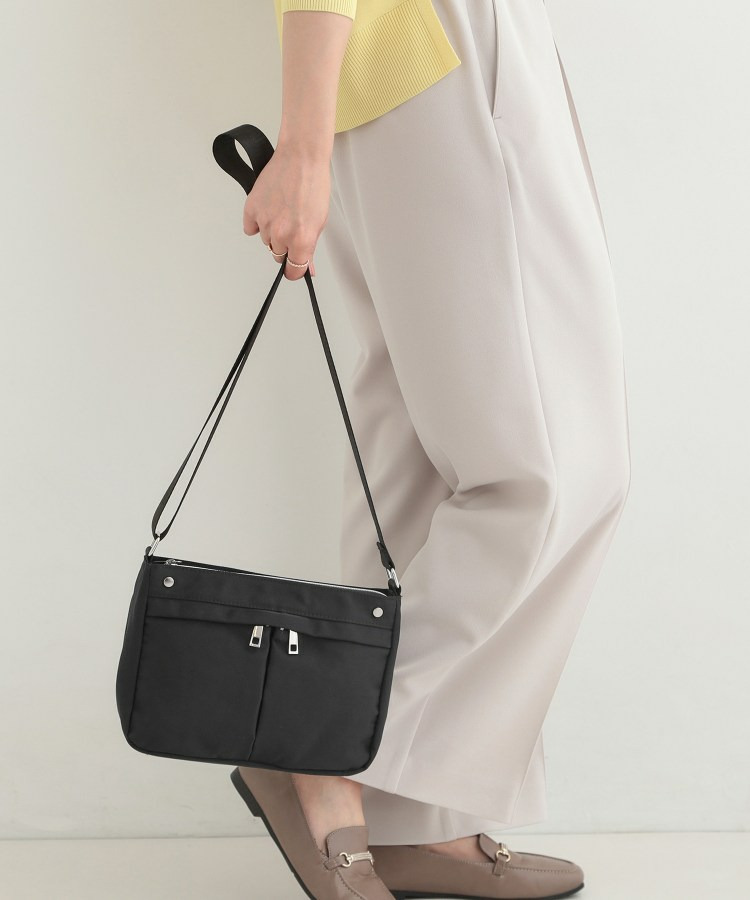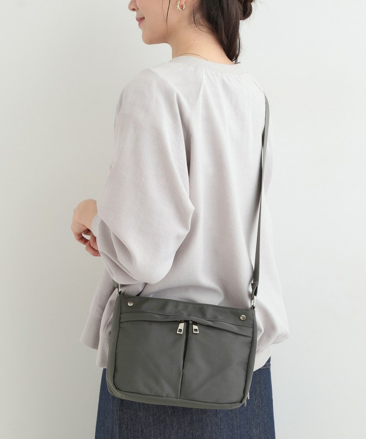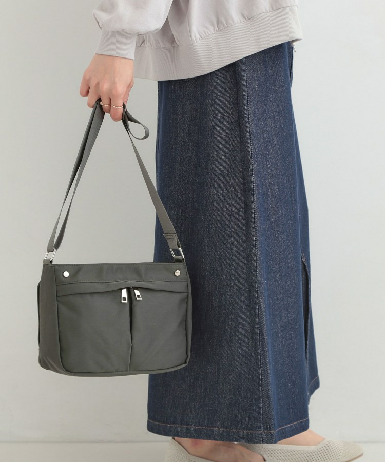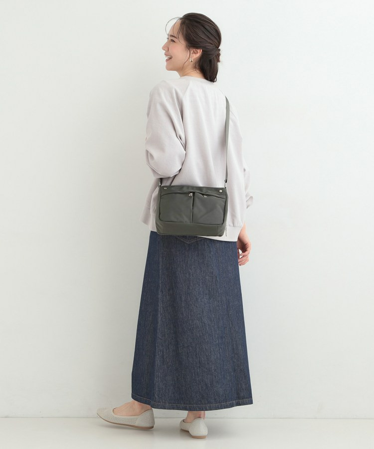 メイン収納の他に、前ポケット、背面にもガバっと開くポケットをのあるショルダーバッグです。
