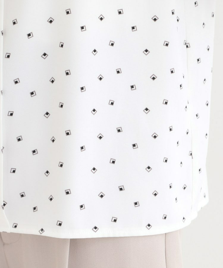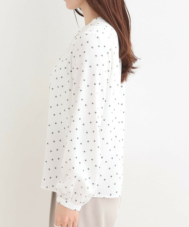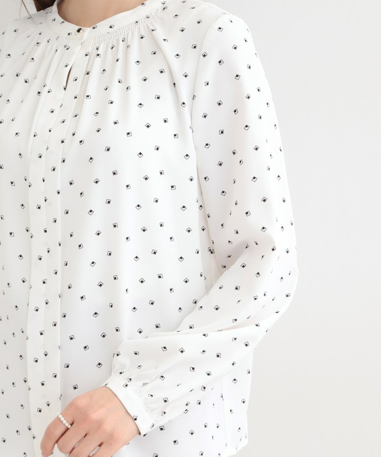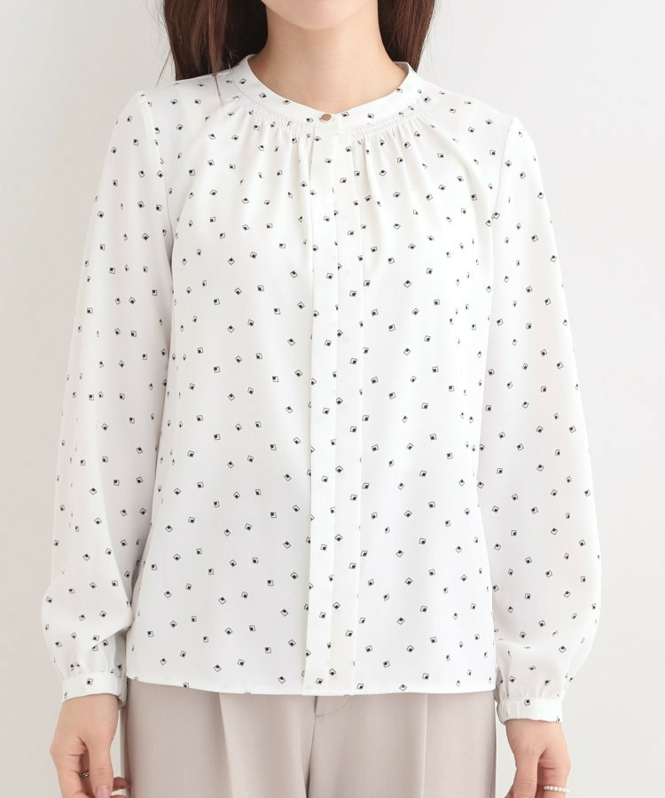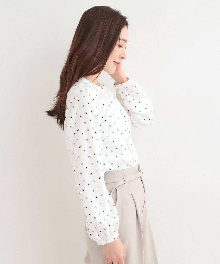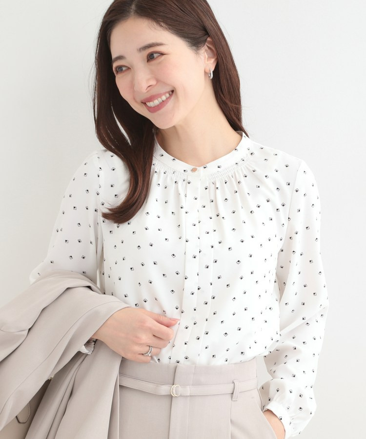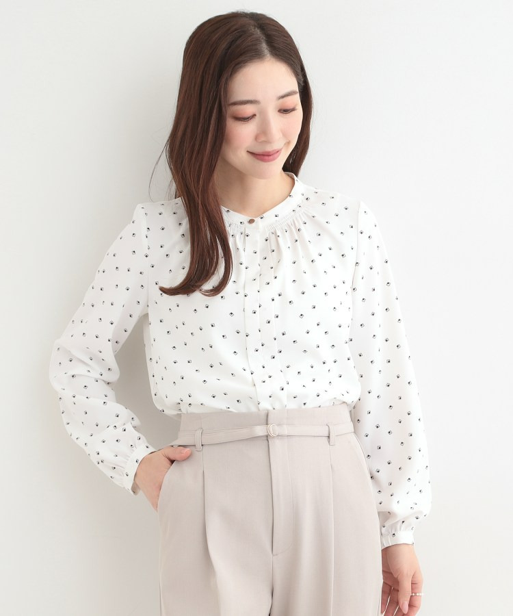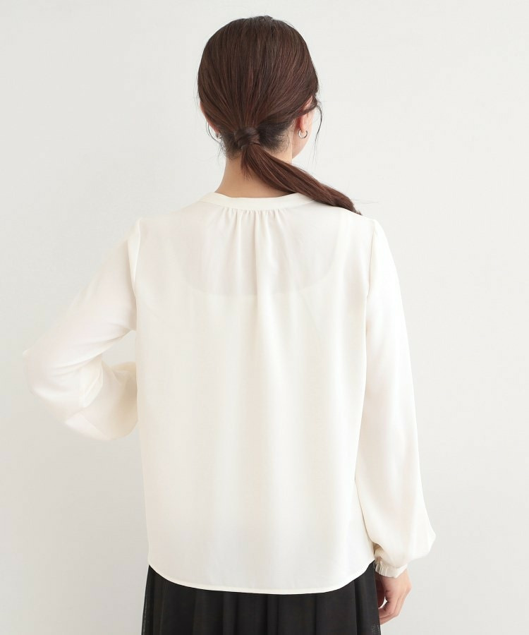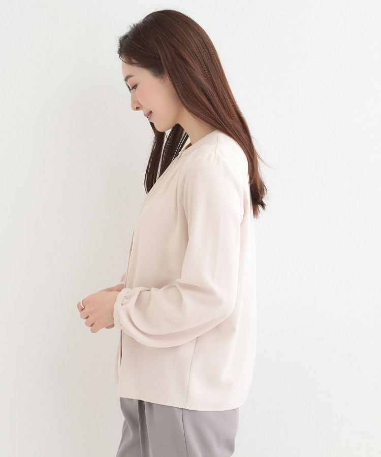 襟ぐりのきらっと光るメタルボタンがアクセントのブラウス。