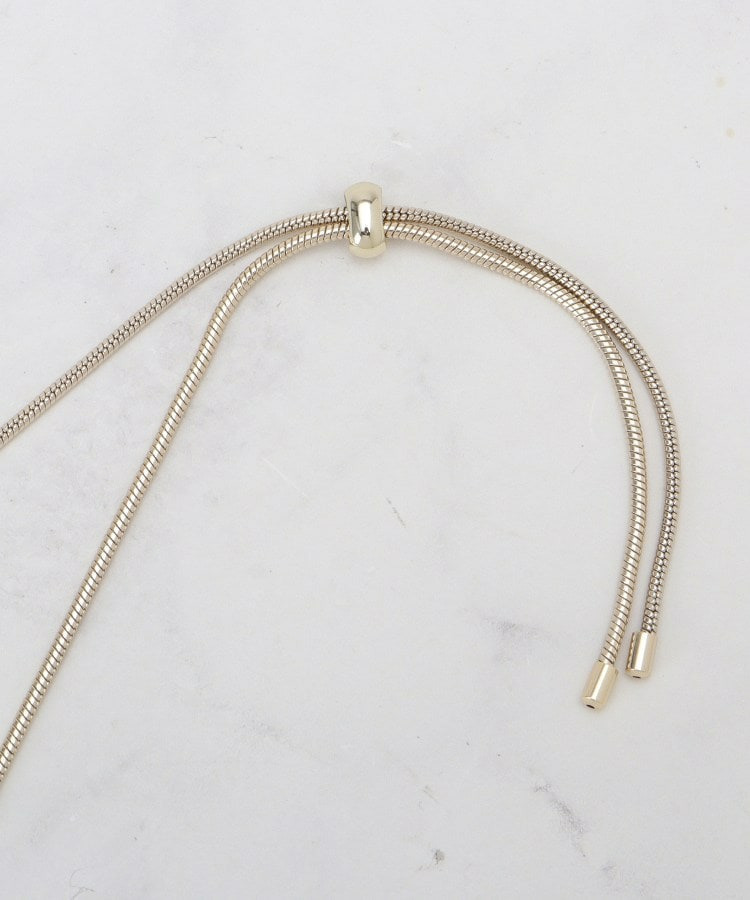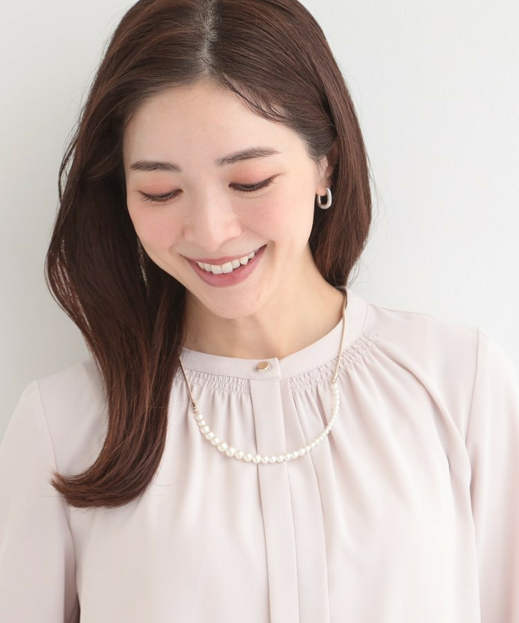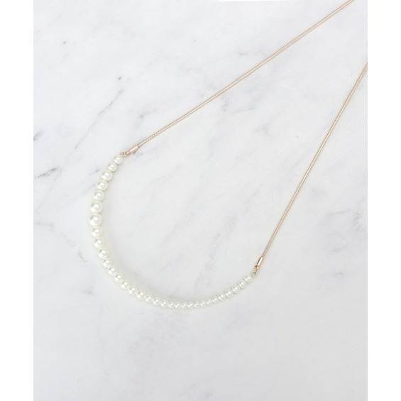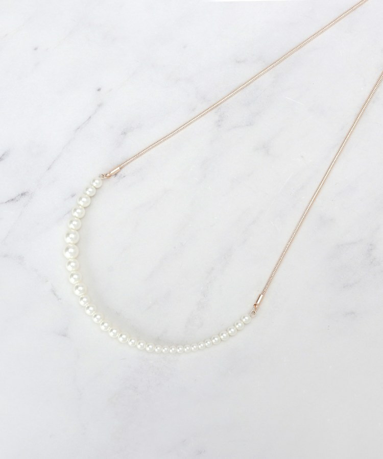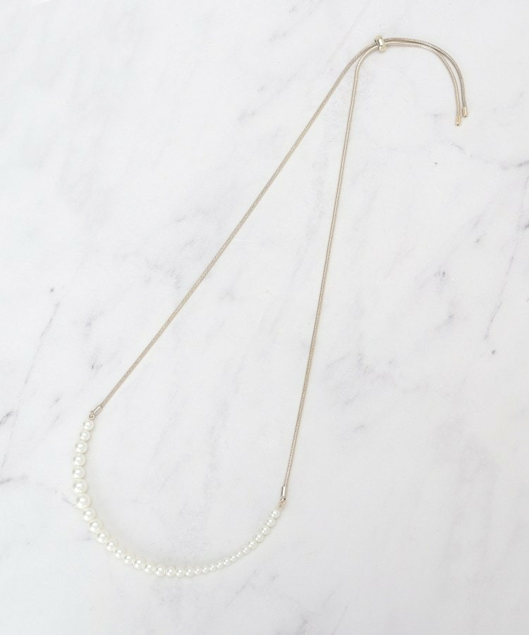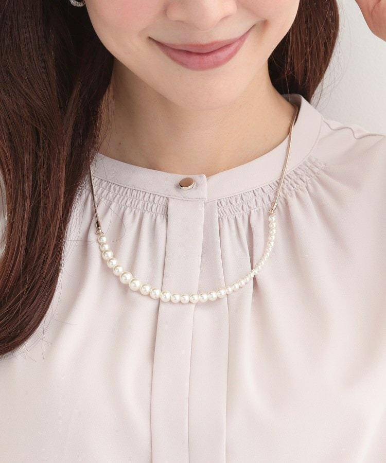 片側に並んだフェイクパールが顔まわりに柔らかなフェミニンさをプラスし、スライドで長さ調整できるノットが縦ラインを自在に演出します。