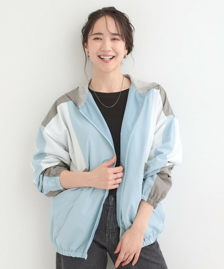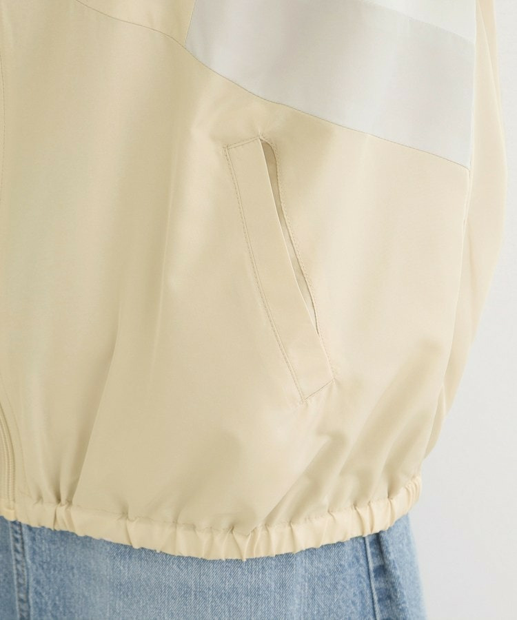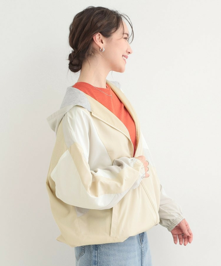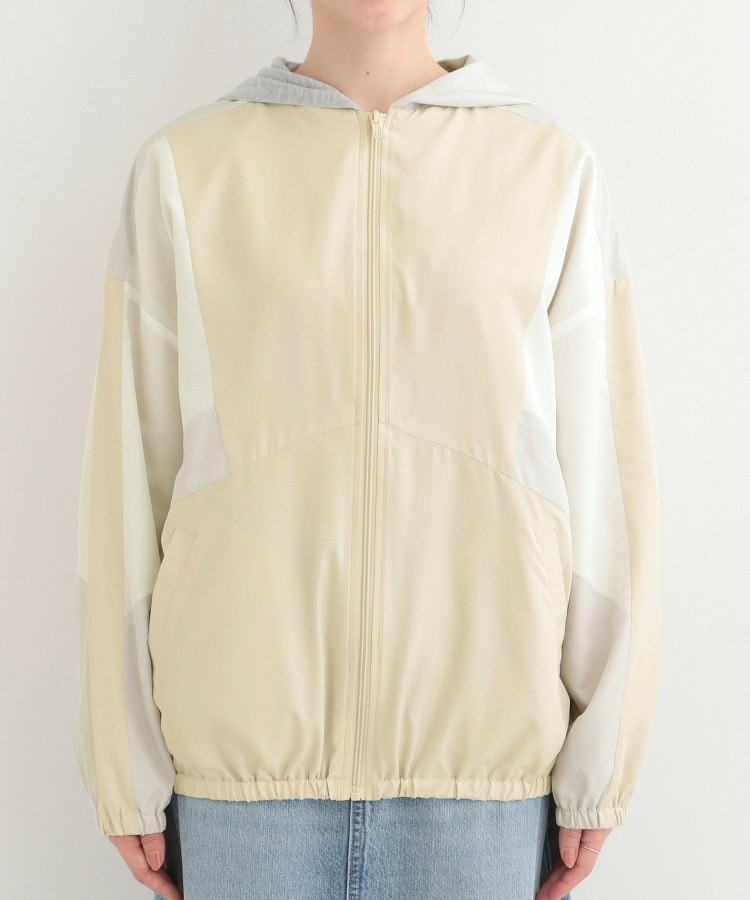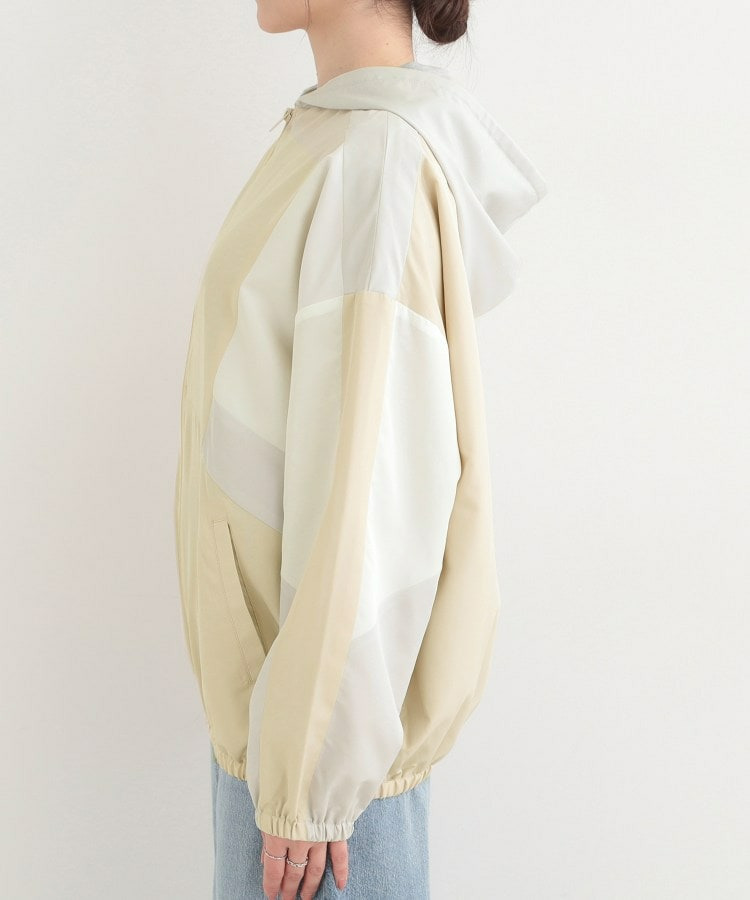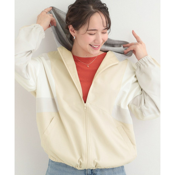 軽やかな素材感と切り替え配色デザインがポイントのフードブルゾン。