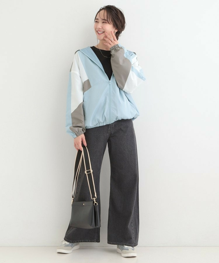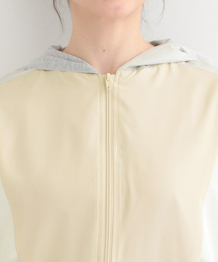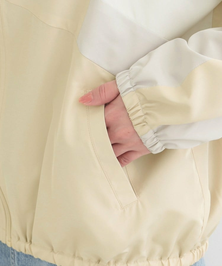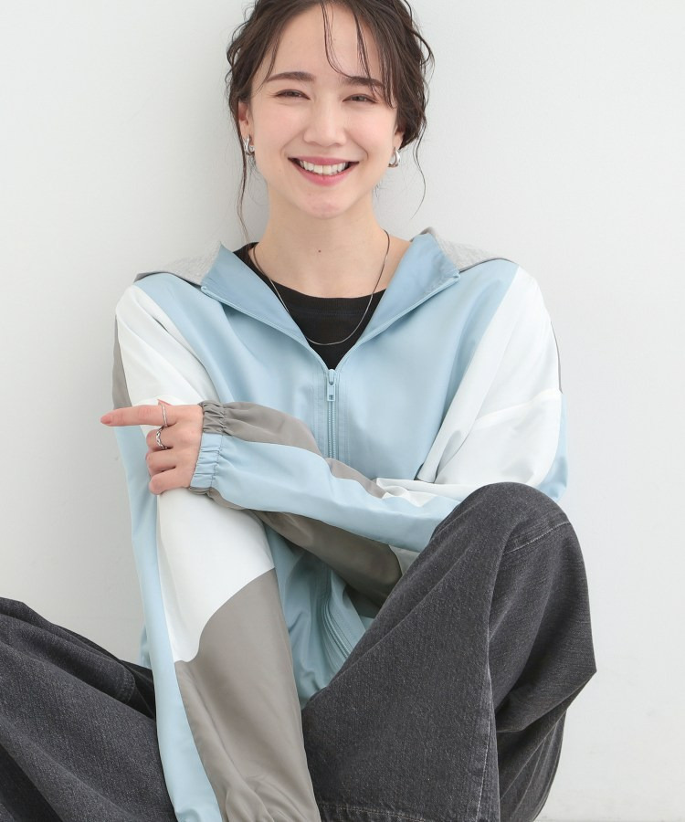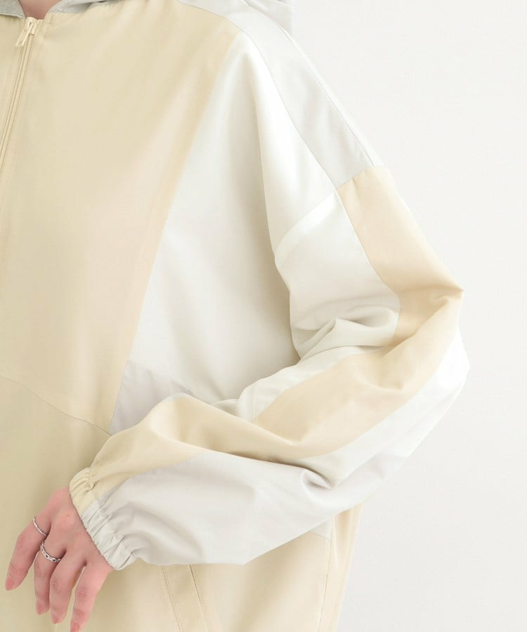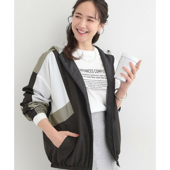 軽やかな素材感と切り替え配色デザインがポイントのフードブルゾン。