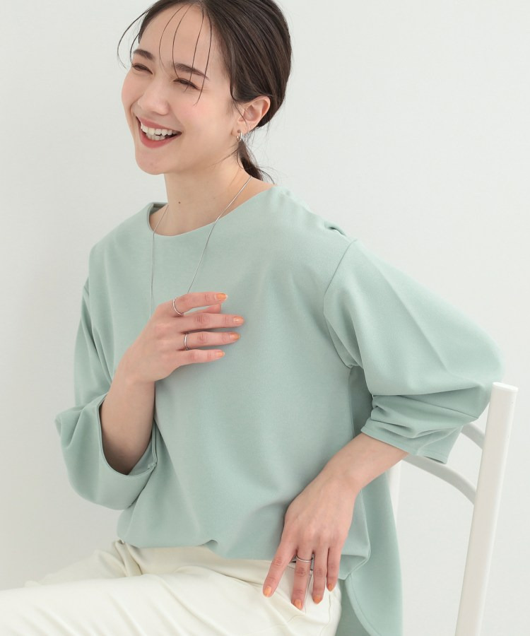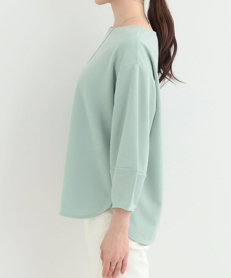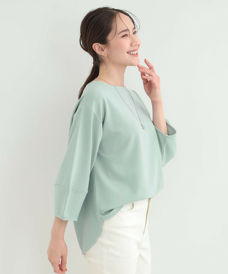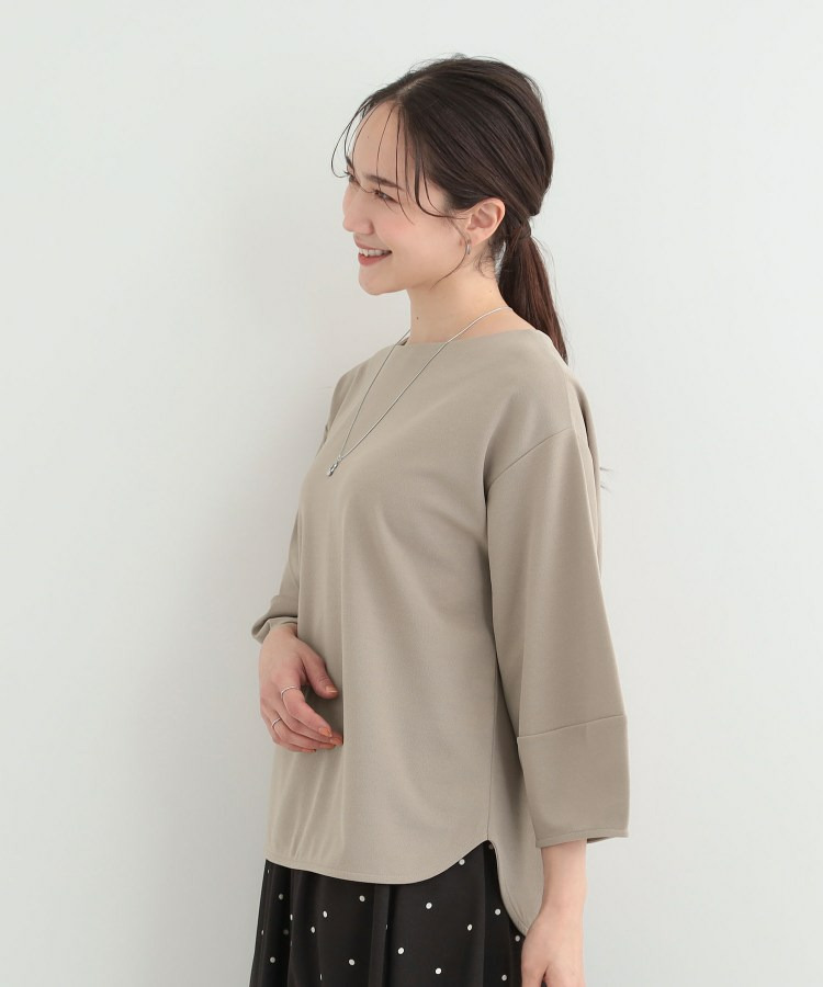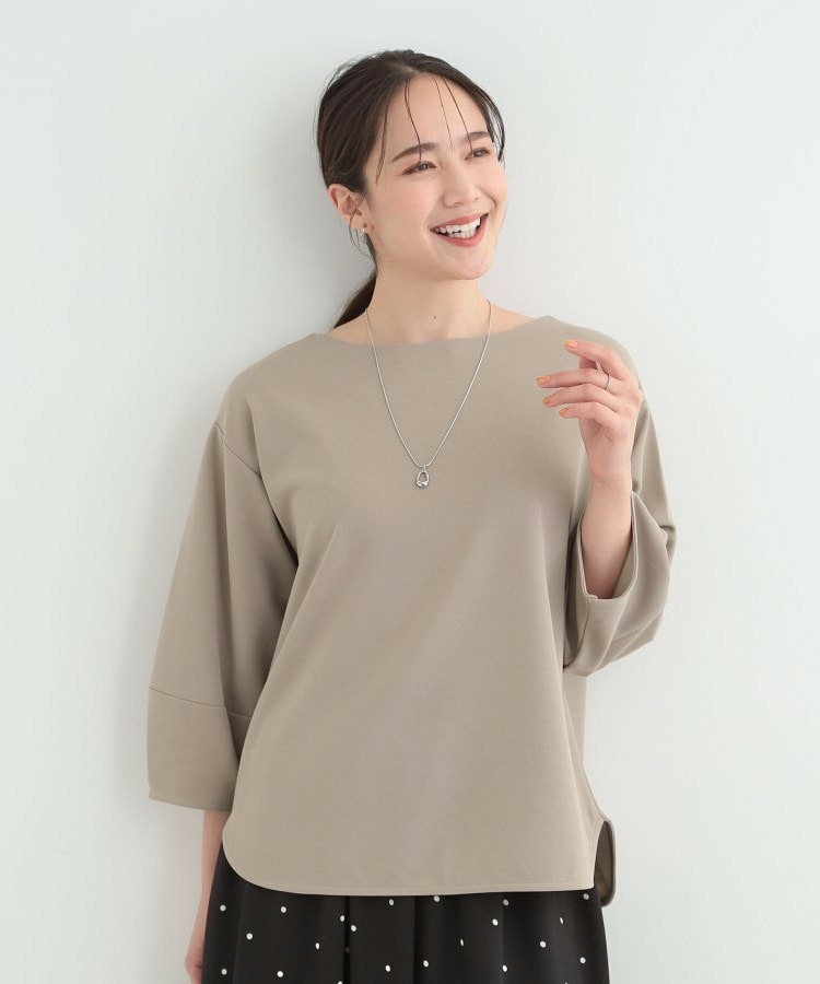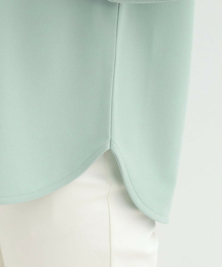 裾はラウンドカットでヒップ周りをさりげなくカバーし、ゆったりとしたシルエットながら、だらしなく見えない計算されたデザインです。