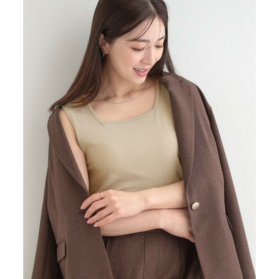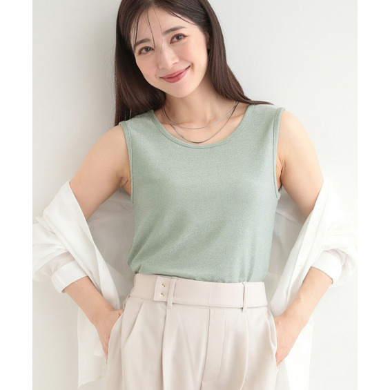 シンプルになりがちなタンクトップは、ラメ素材でコーディネートのポイントに。