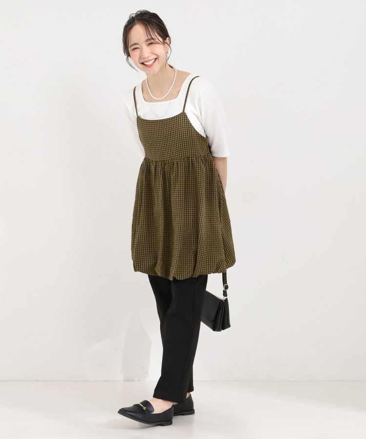 細めのストラップとスクエアネックで鎖骨まわりをすっきり見せ、バルーンシルエットで腰まわりをカバー。