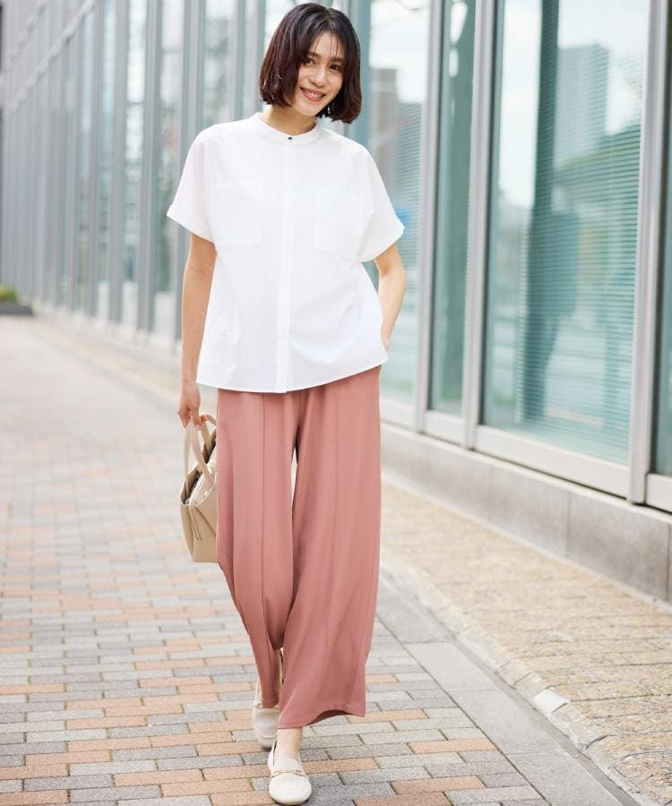 同素材のブラウス(C62-85011)と合わせると、セットアップとして着用出来て、さっとサマになるスタイリングでおすすめです。