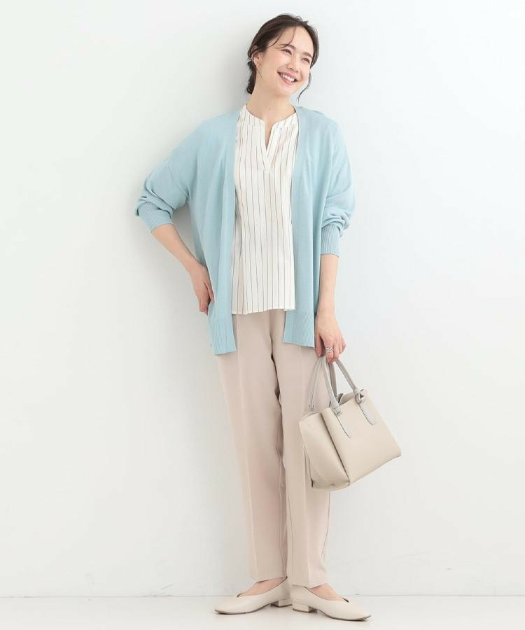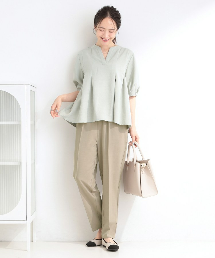 すっきりとしたシルエットなので、ゆったりしたブラウスや、ボリューム感のあるシャツ合わせていただくととバランスが良いです。