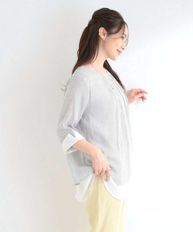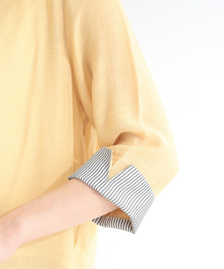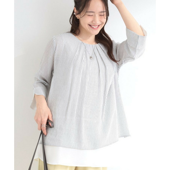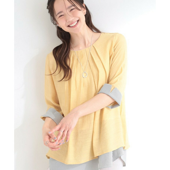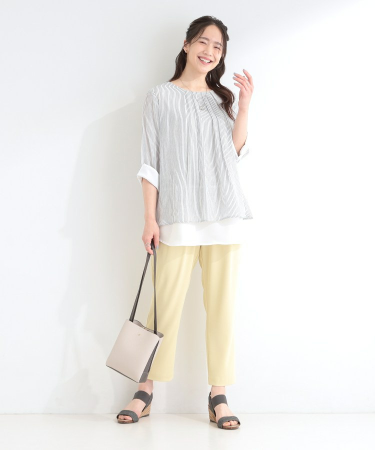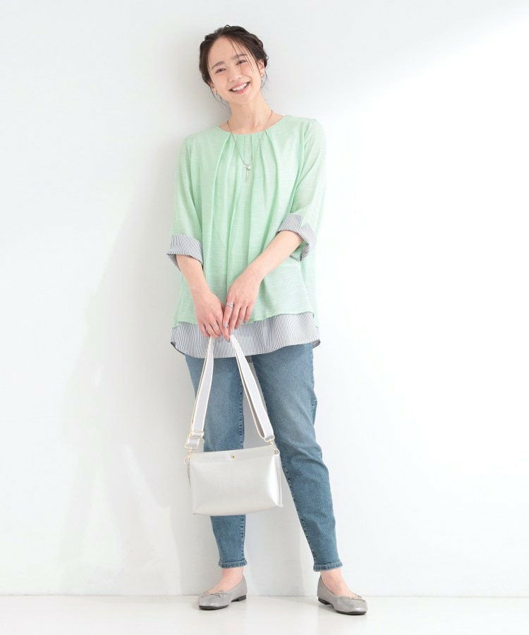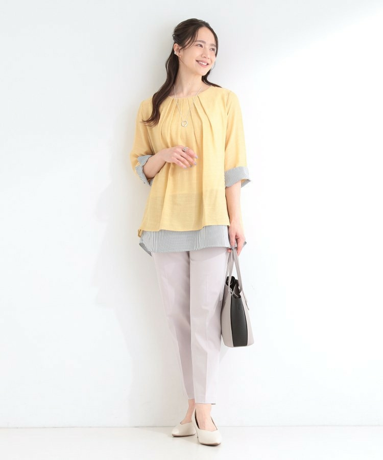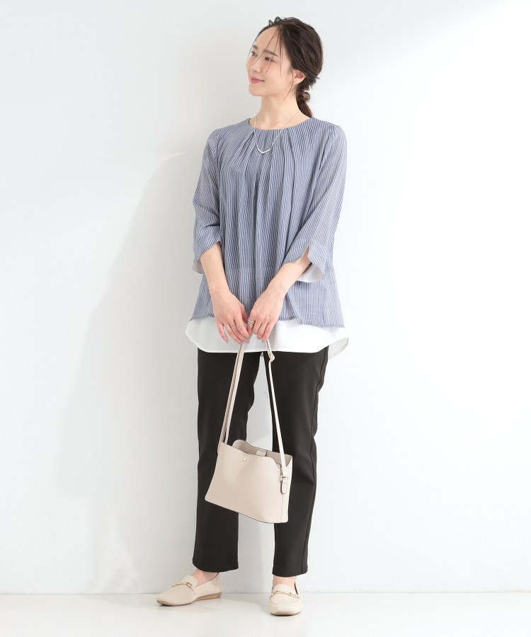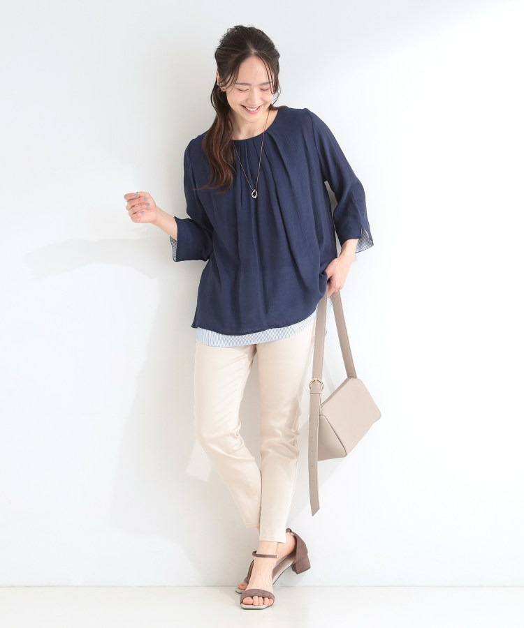 腰周りが隠れる着丈で体型カバーも出来て、7分袖デザインも軽やかな印象のスタイリングになります。