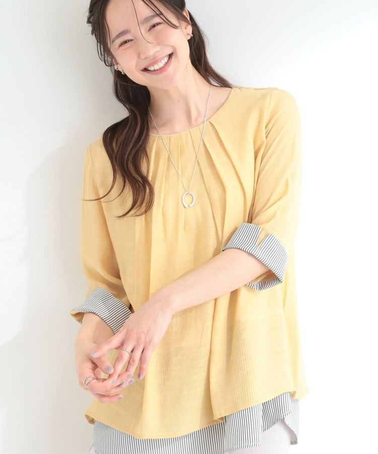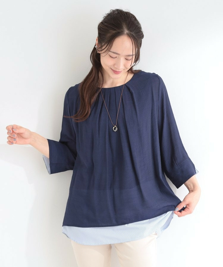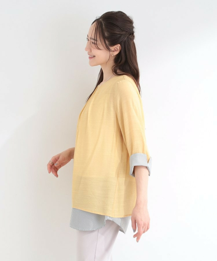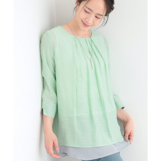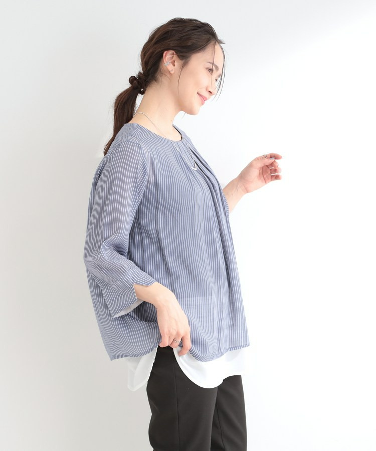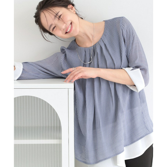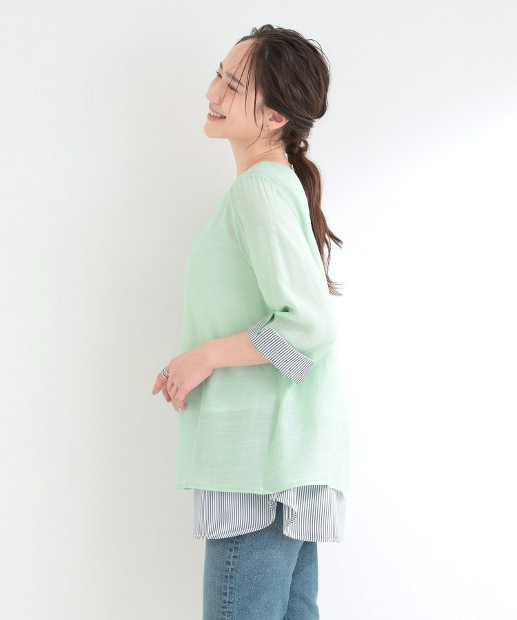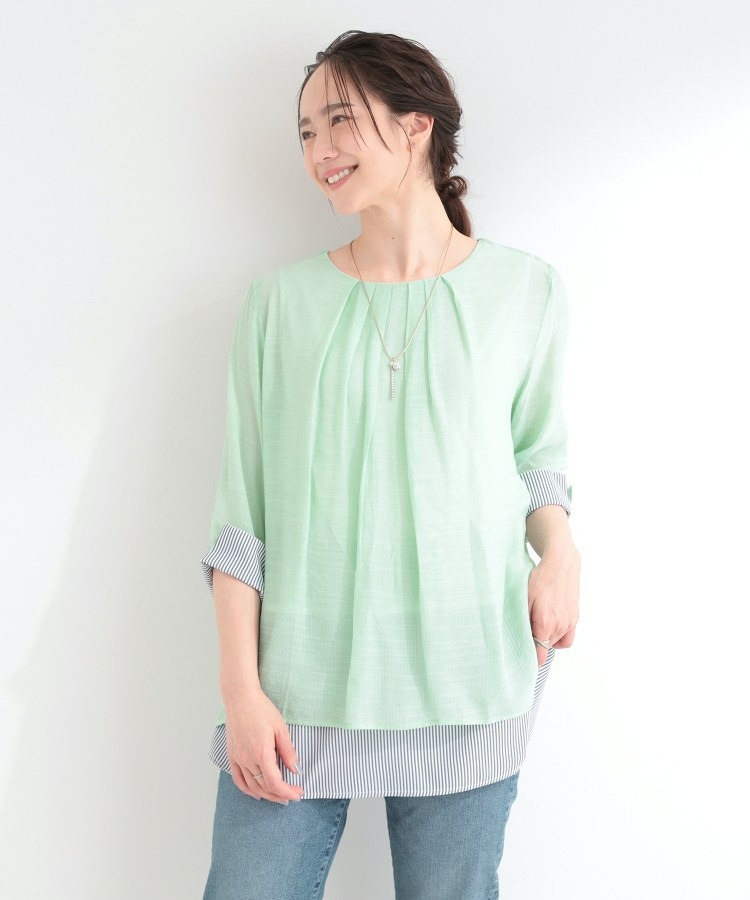腰周りが隠れる着丈で体型カバーも出来て、7分袖デザインも軽やかな印象のスタイリングになります。