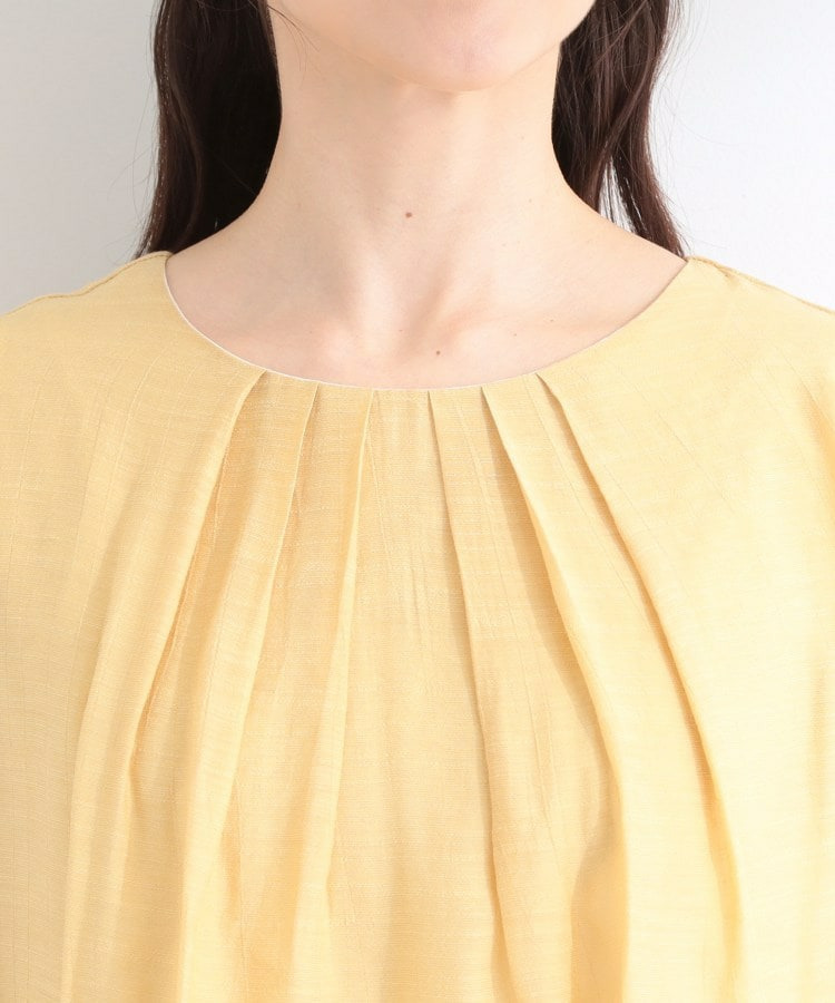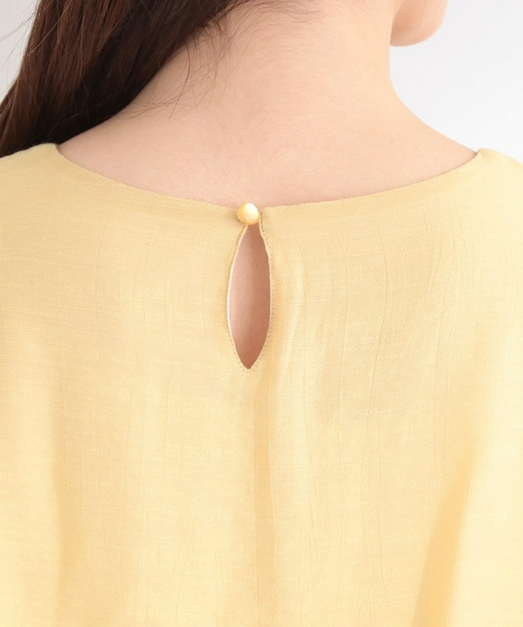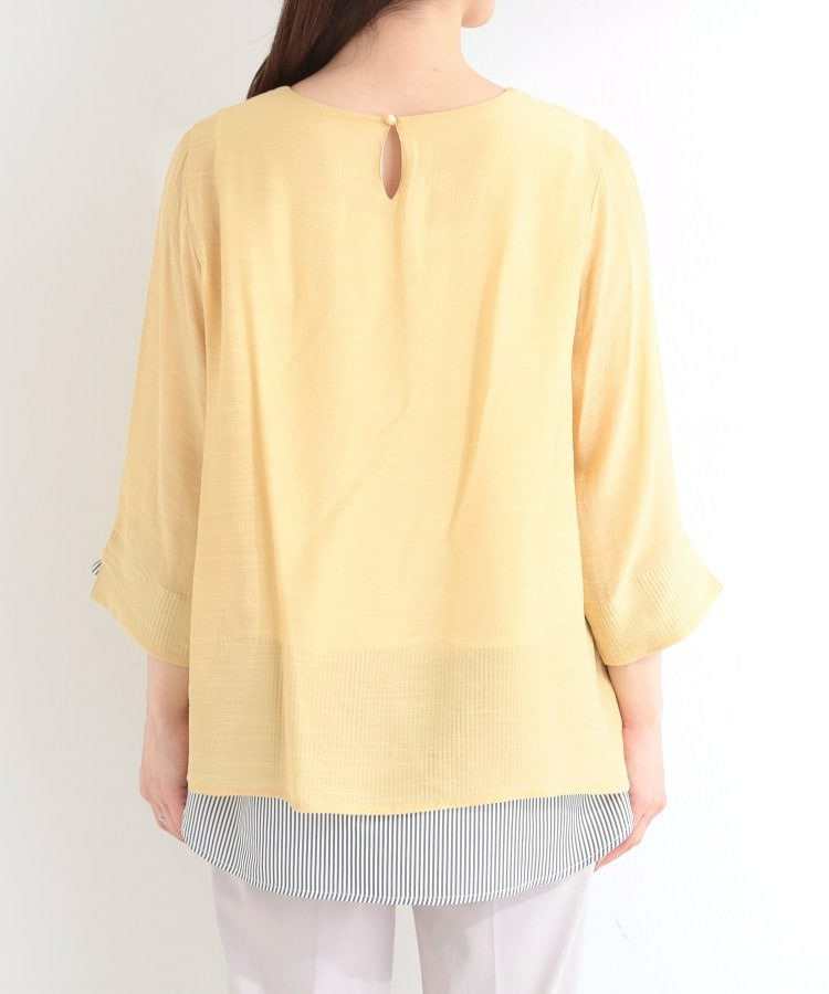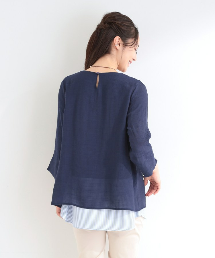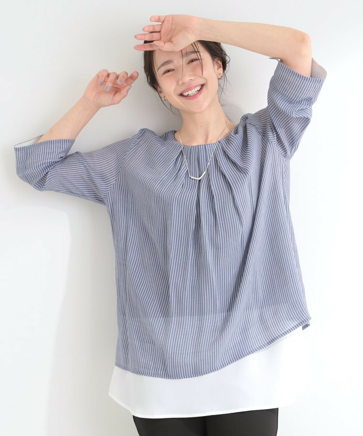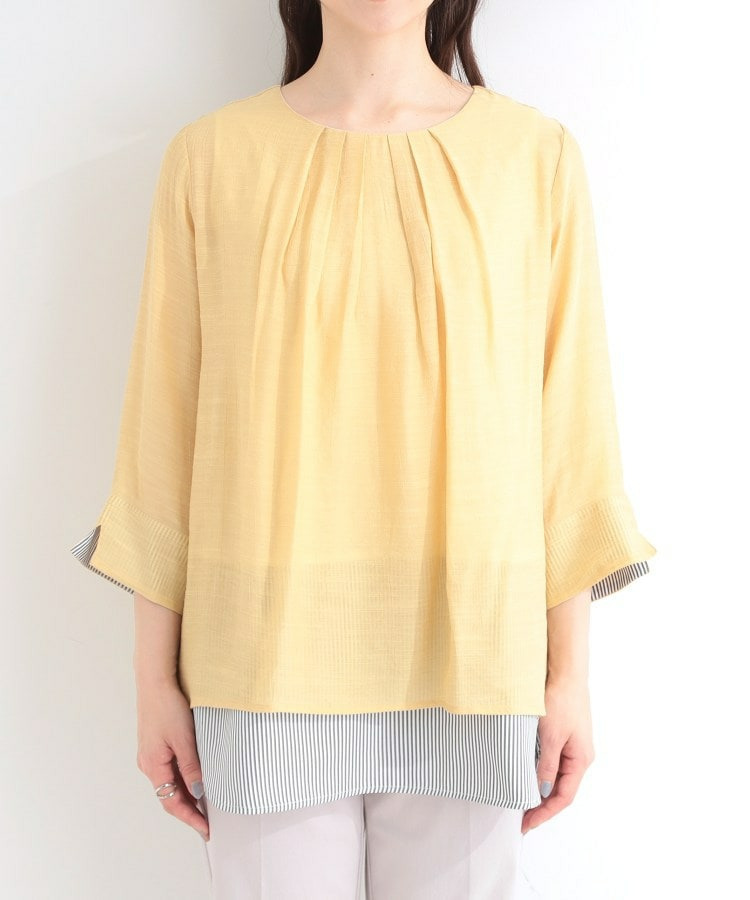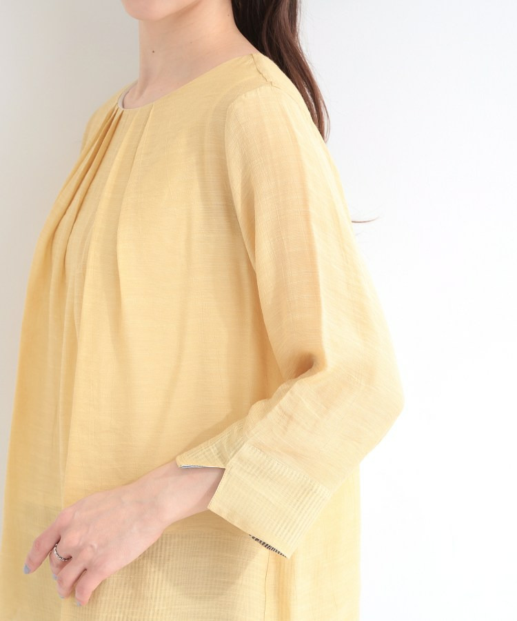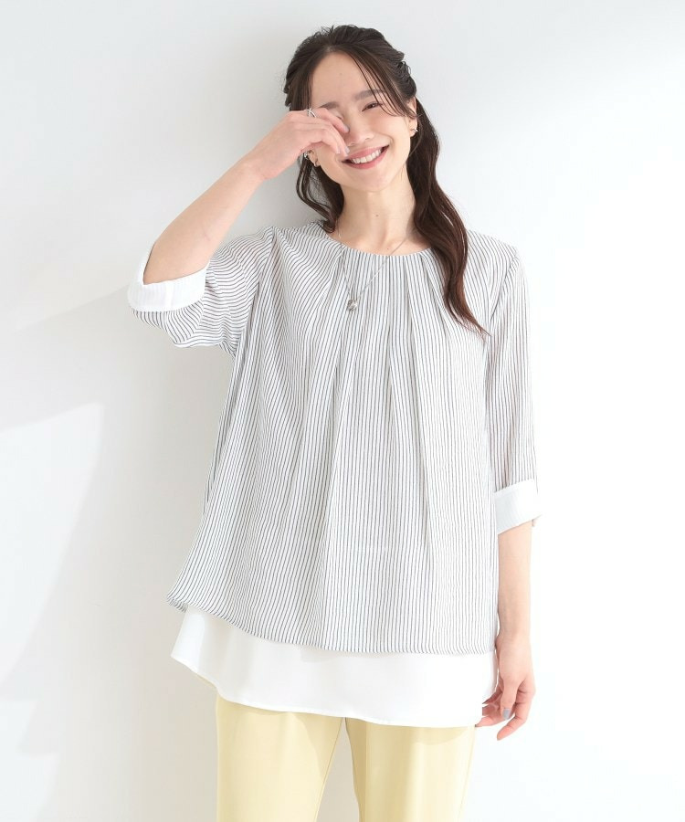 腰周りが隠れる着丈で体型カバーも出来て、7分袖デザインも軽やかな印象のスタイリングになります。