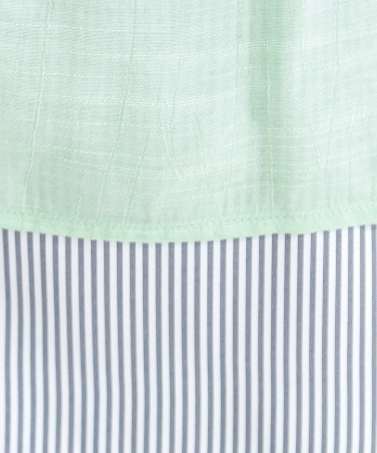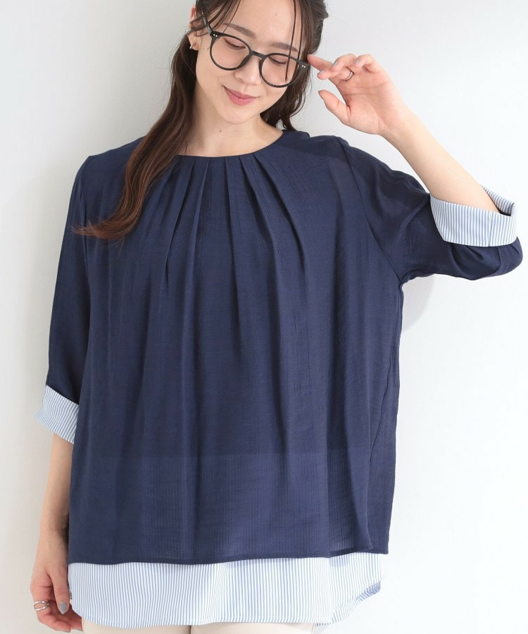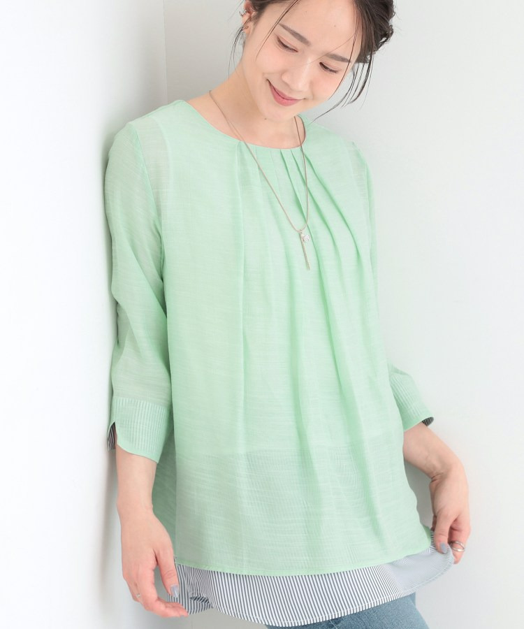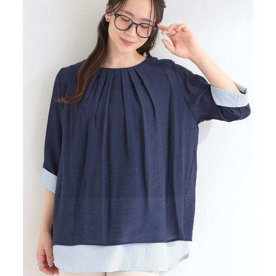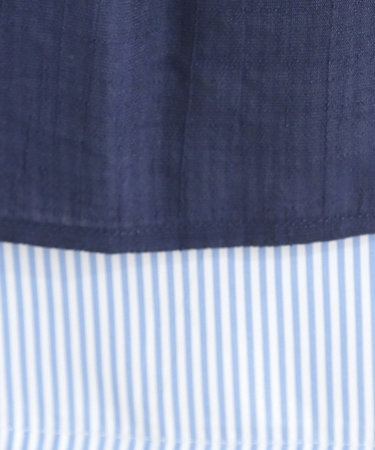 1枚着るだけでコーデが完成するドッキングデザインで、裾から覗くシャツ生地がアクセントになります。