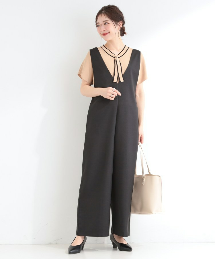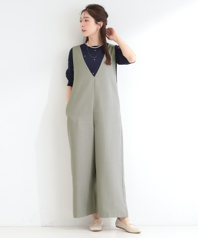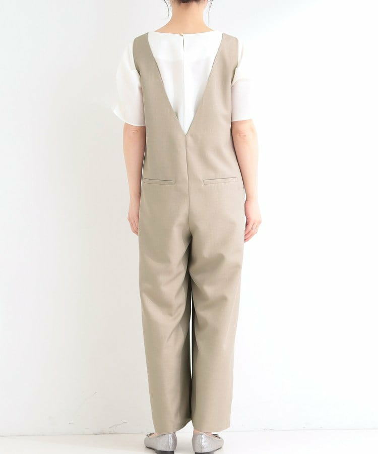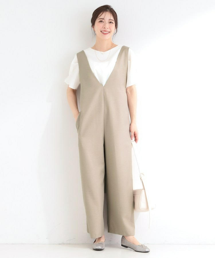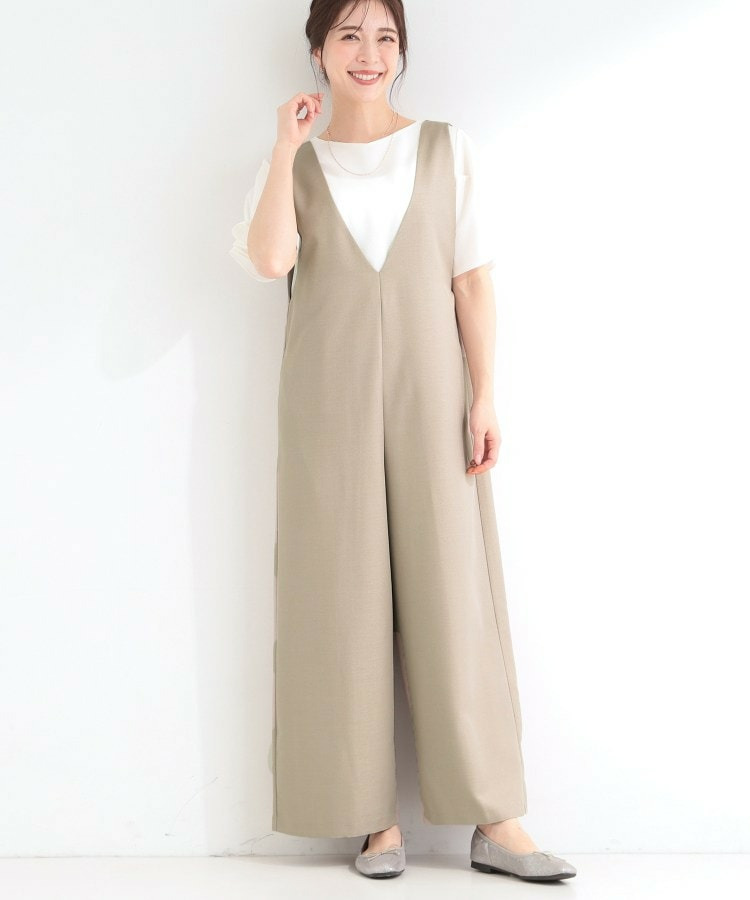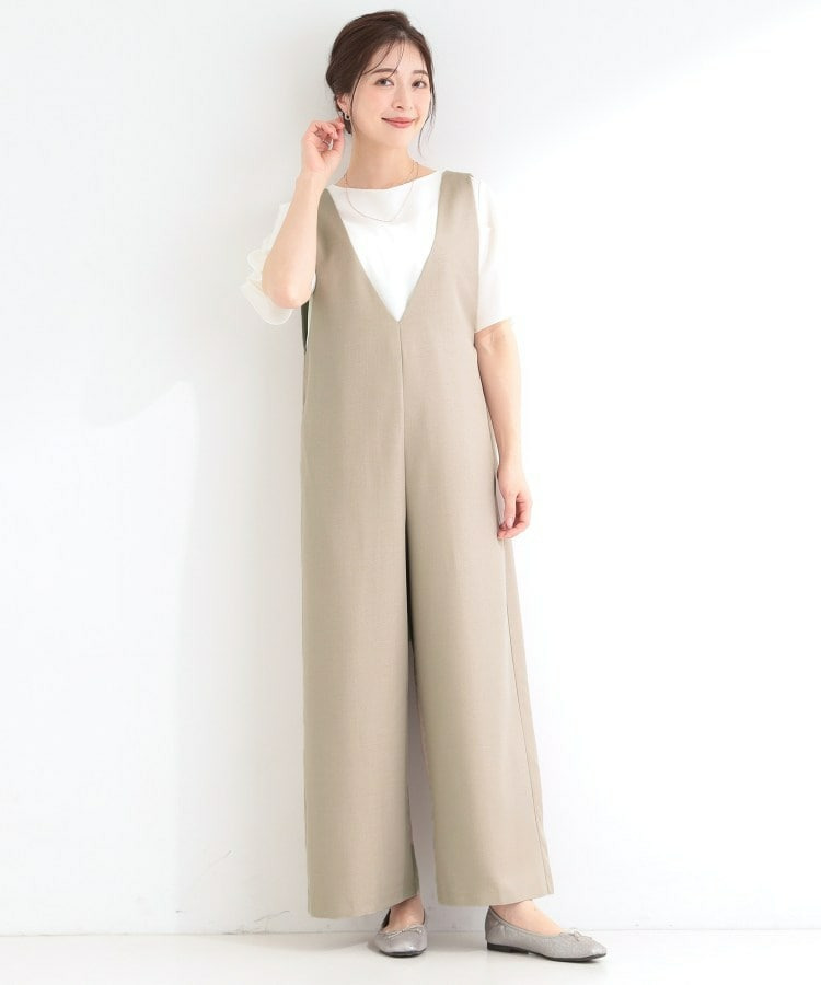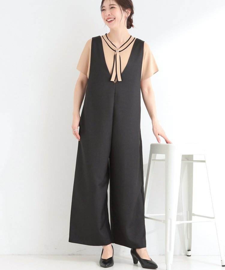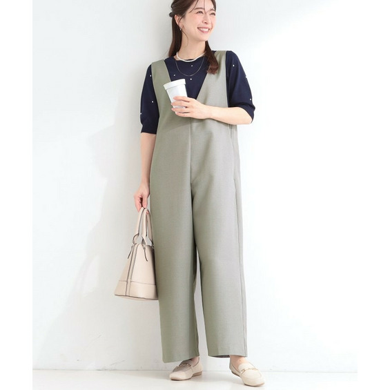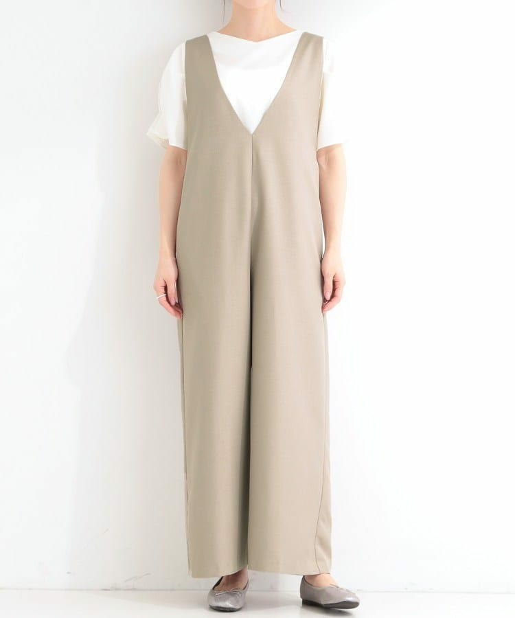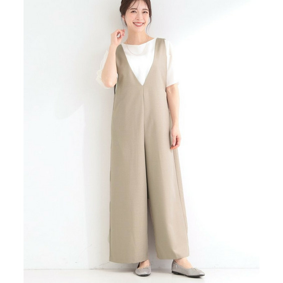 深めのVネックがすっきりした印象のシンプルなオールインワン。
