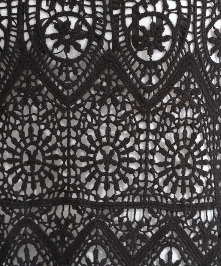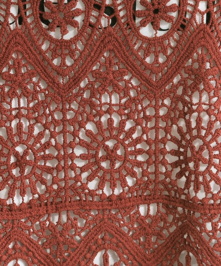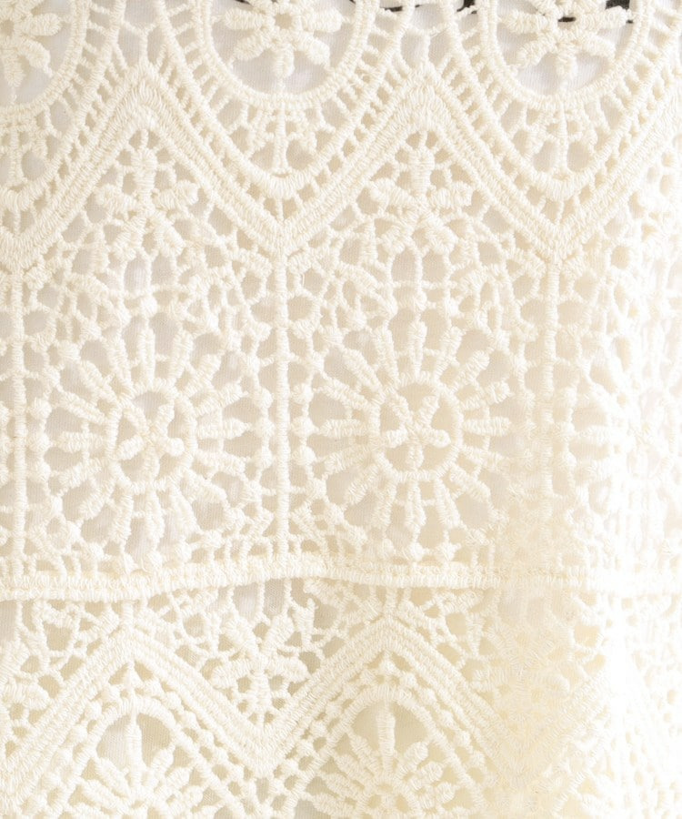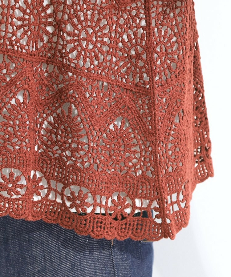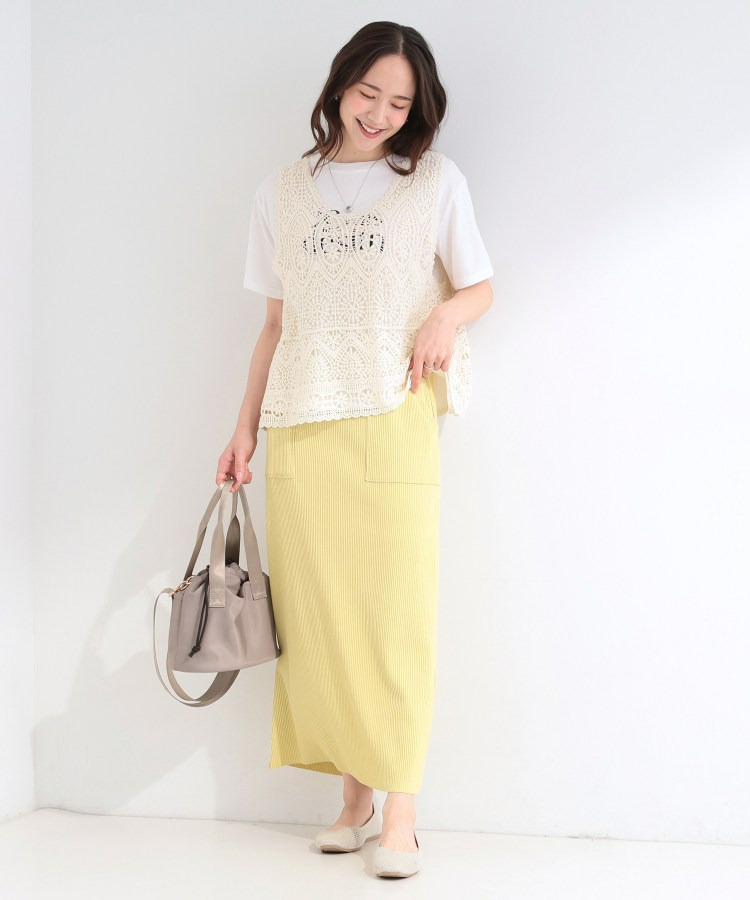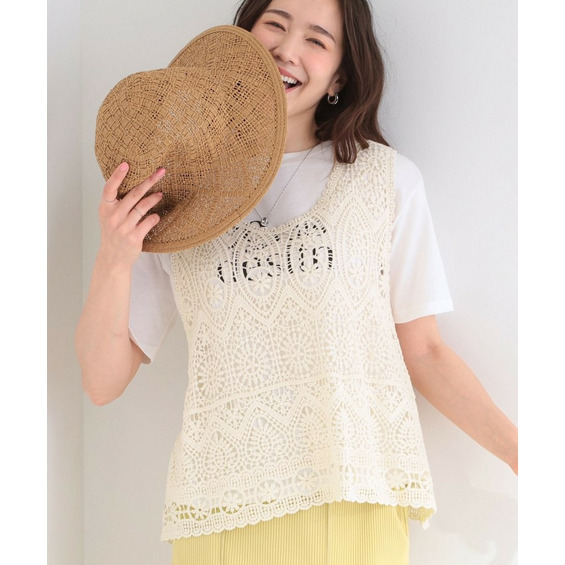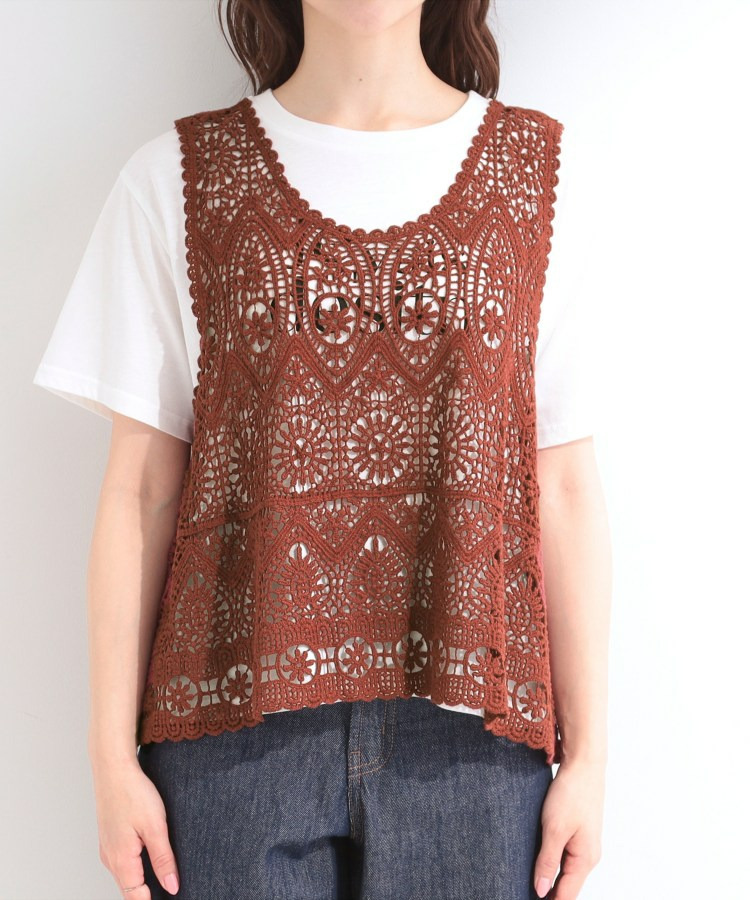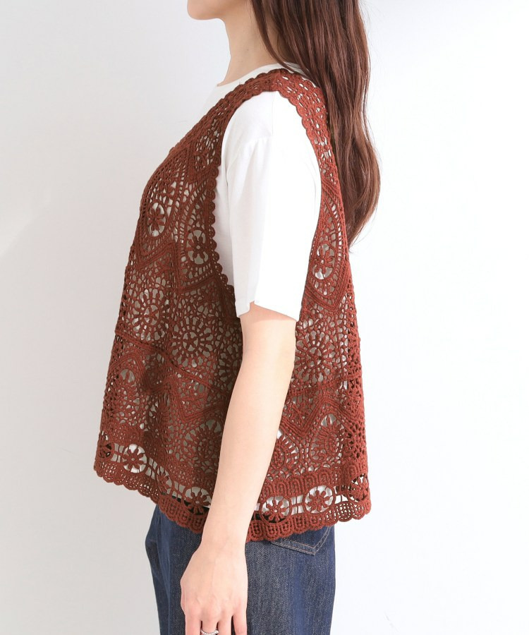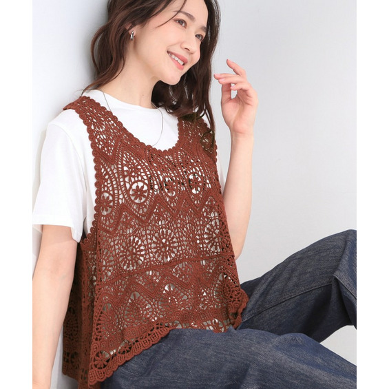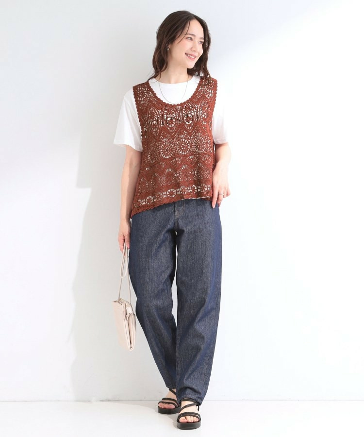 体型カバーにも嬉しいクロシェ編みのベストは、編み柄も大人っぽくこだわりこなれた印象に。