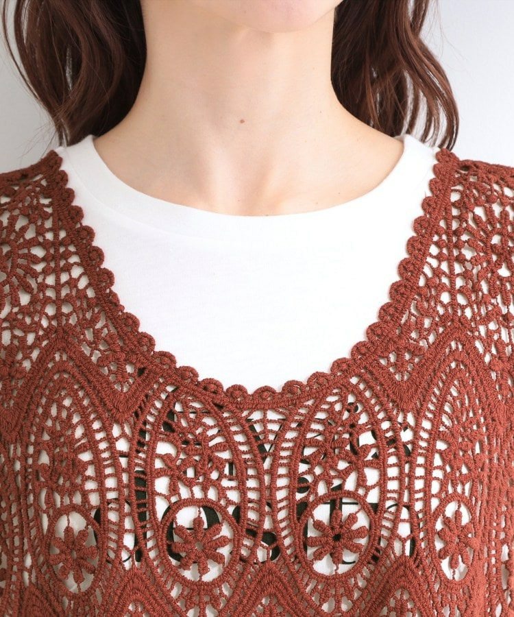 やわらかなクロシェ編みのベストと、カットソー素材のTシャツの2点セットになっています。