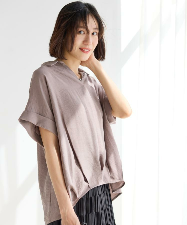 スキッパー襟で顔まわりをすっきり見せつつ、フロントのタックデザインがさりげない立体感をプラス。