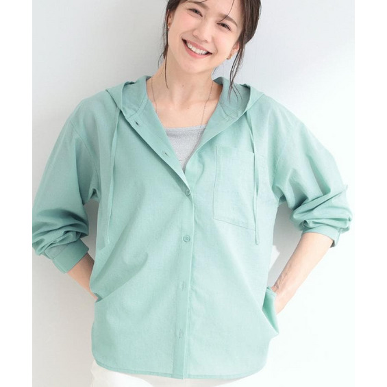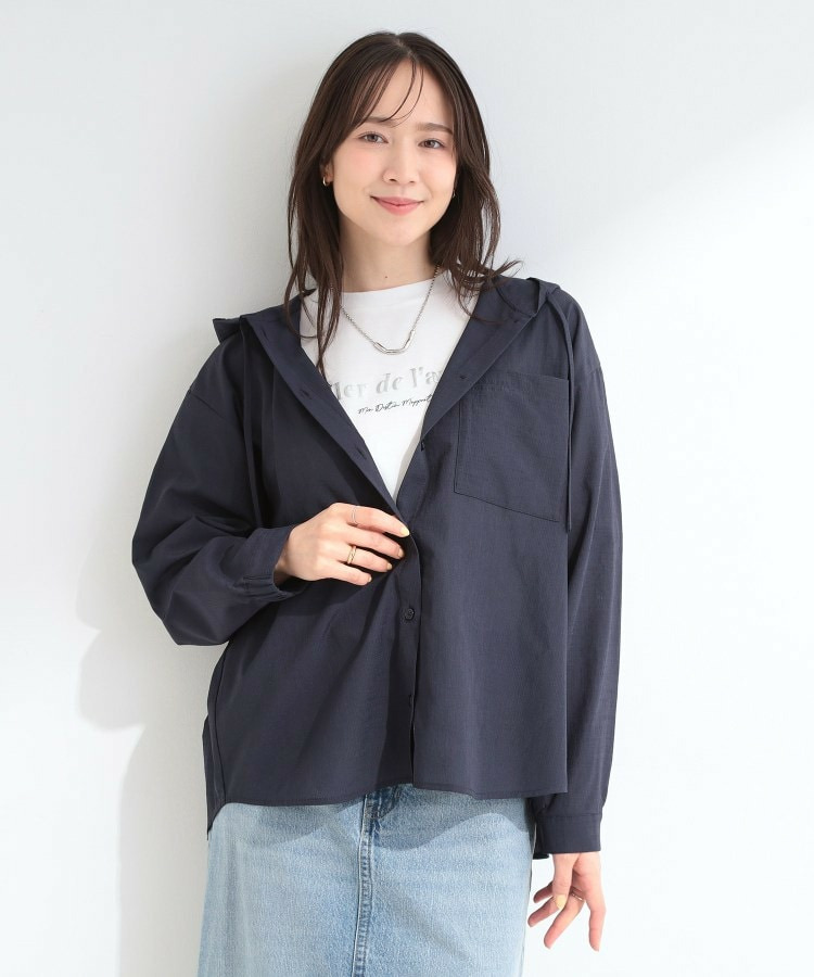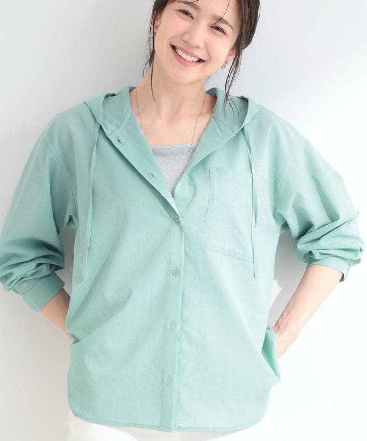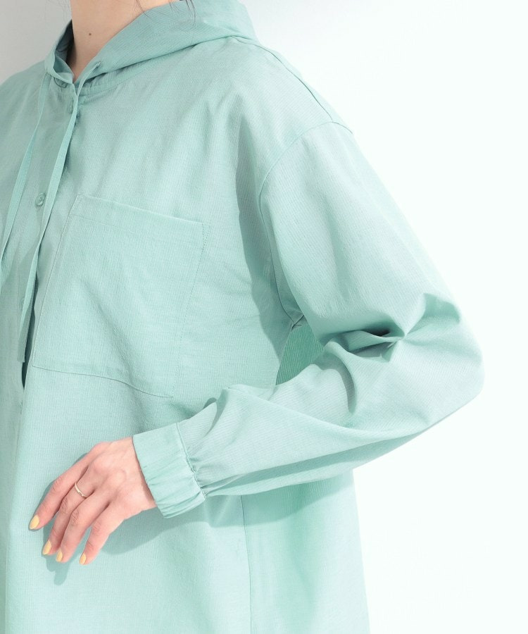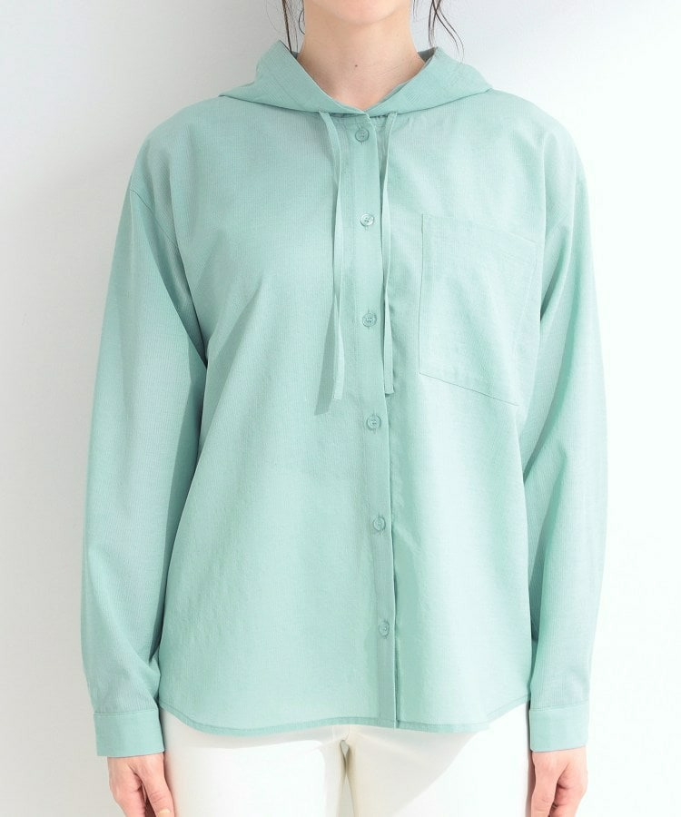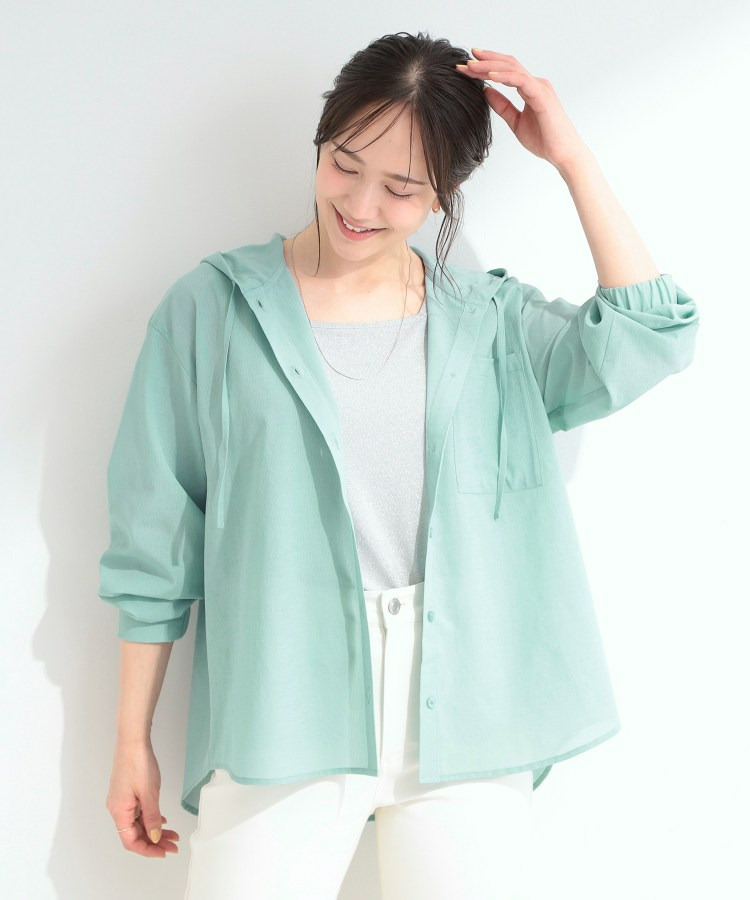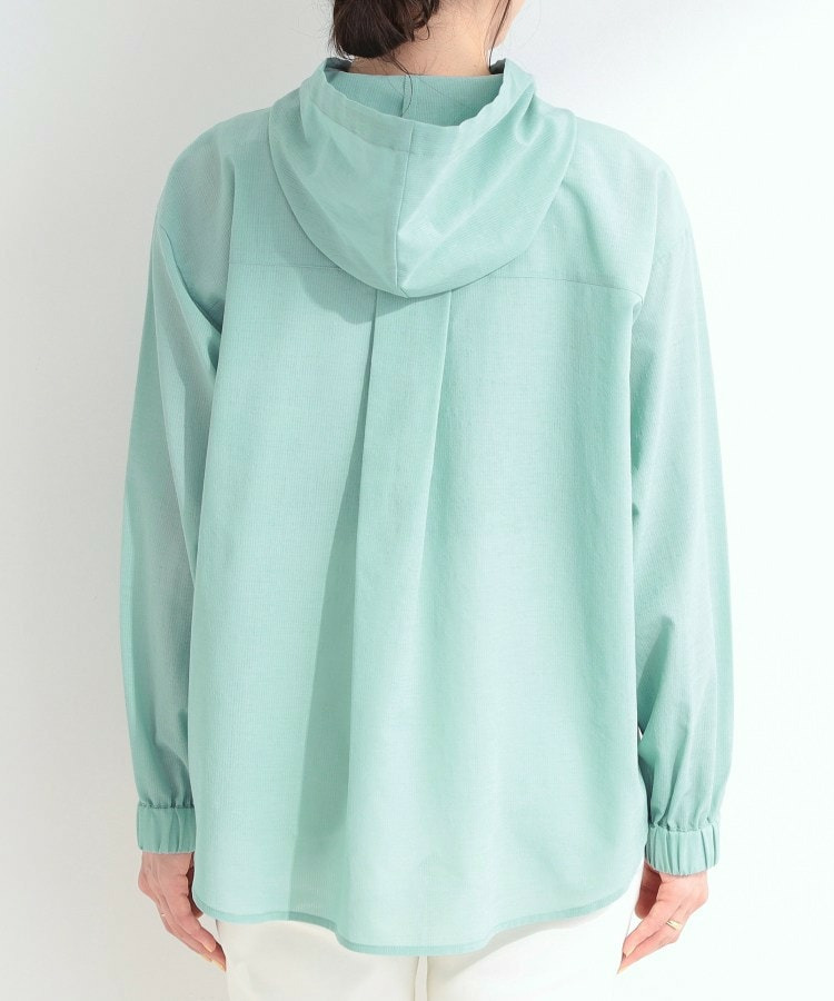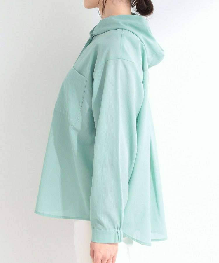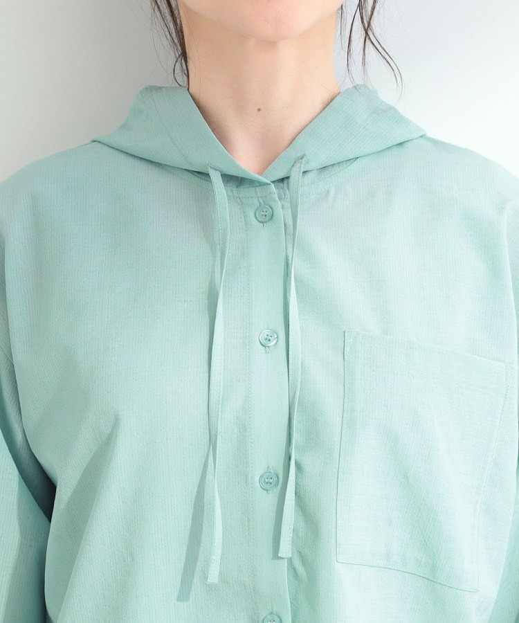 通気性に富んだ素材で、軽やかな印象のフード付きシャツ。