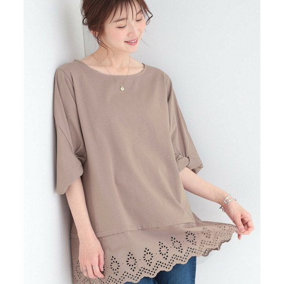 裾には美しい花柄刺繍のアイレットレースを施し、シンプルな中にも上品な女性らしさをプラス。