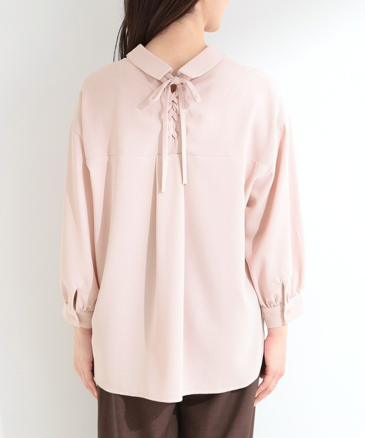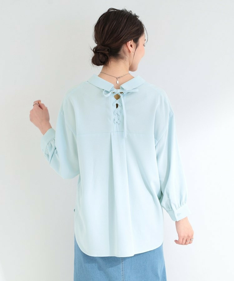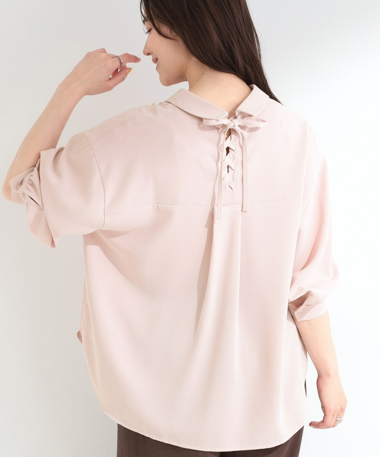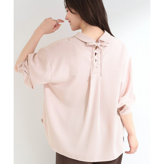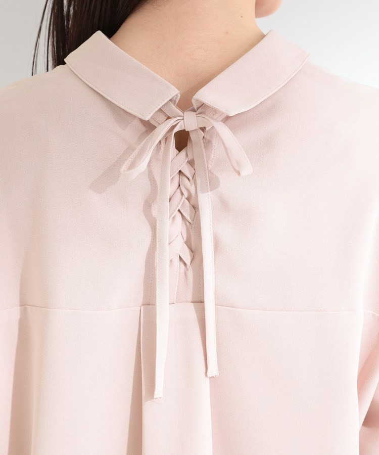 バックスタイルのレースアップデザインが目を引く、デザインブラウス。