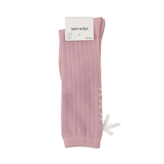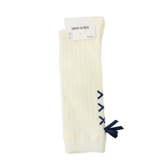 サテンリボンとレースアップ柄がポイントのハイソックスはお出かけやデイリー使いにオススメなデザイン。