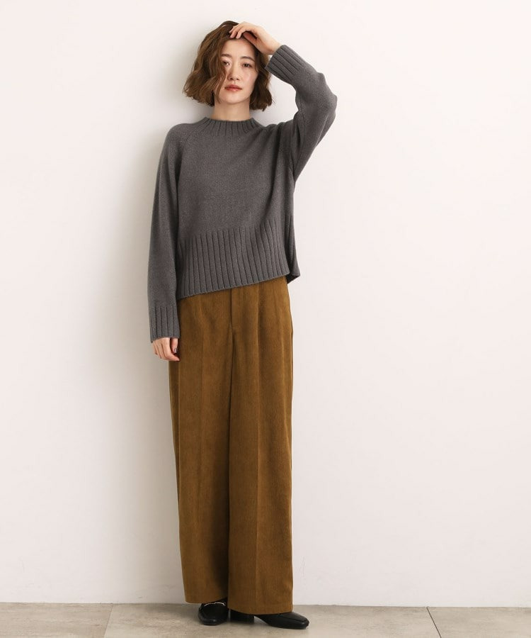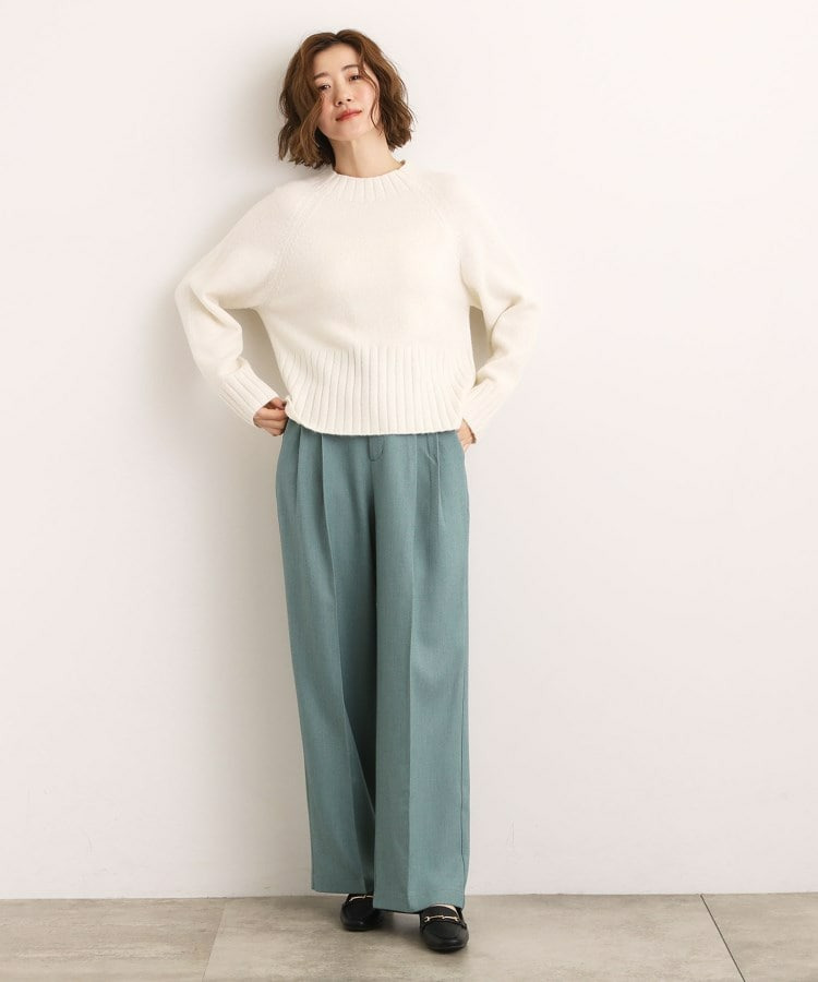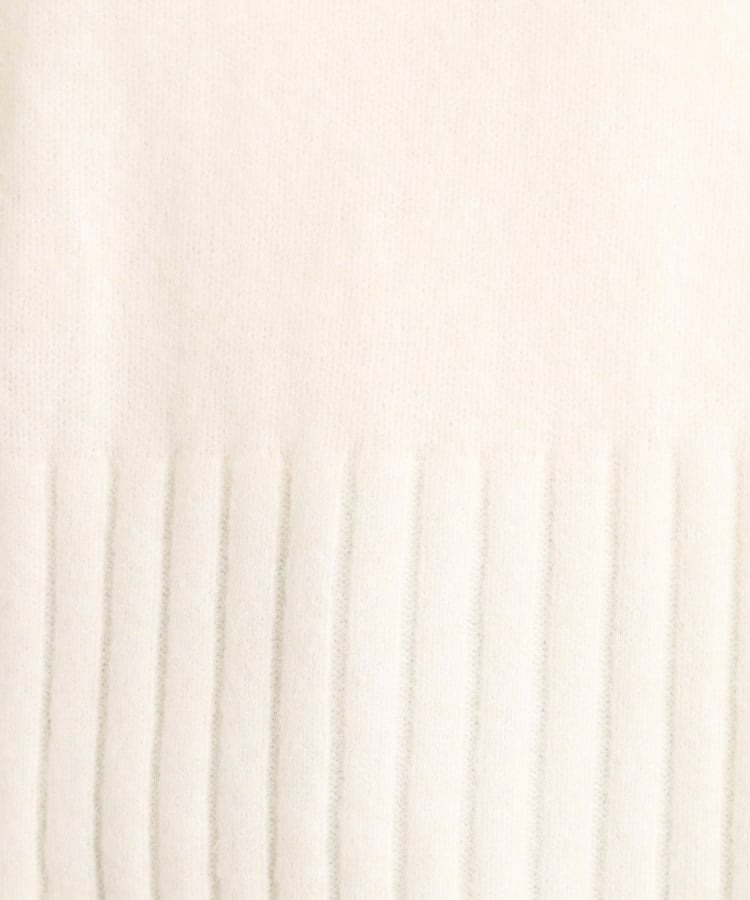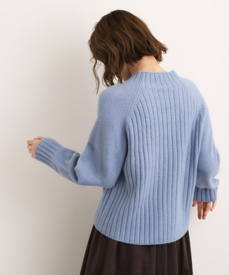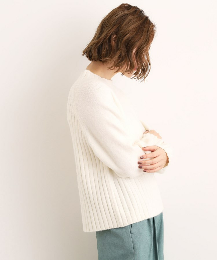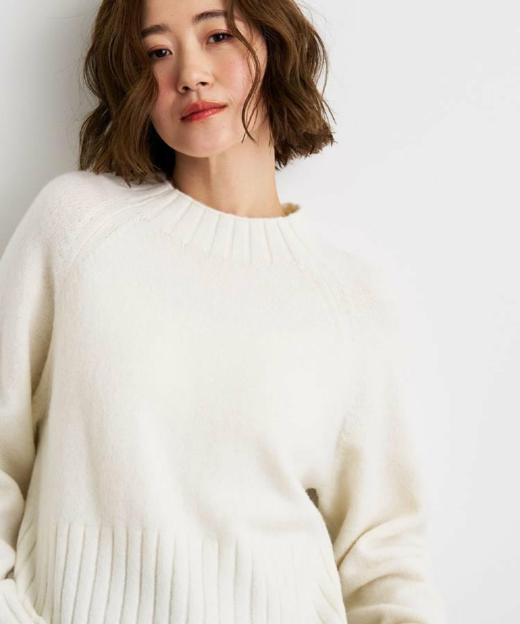 前身頃はすっきりとした天竺編み、裾と後ろ身頃にはワイドリブを取り入れ、シンプルながら編地のコントラストで存在感を演出。
