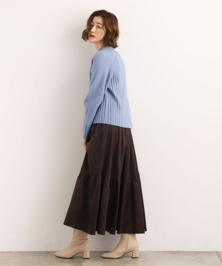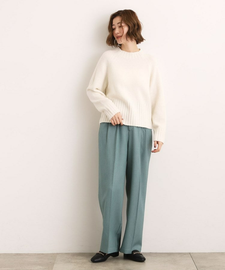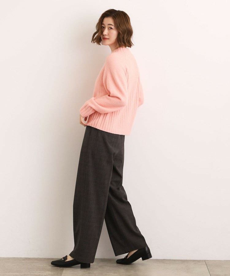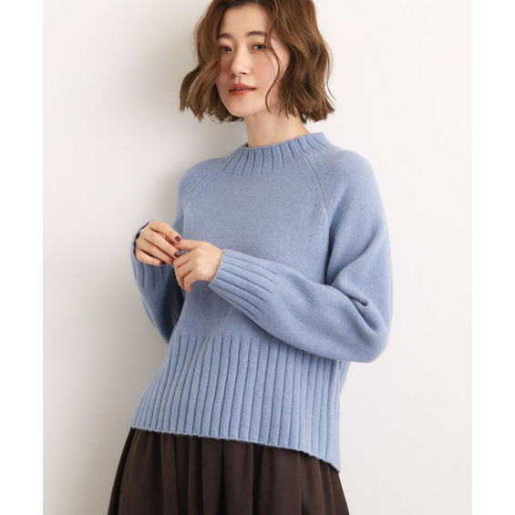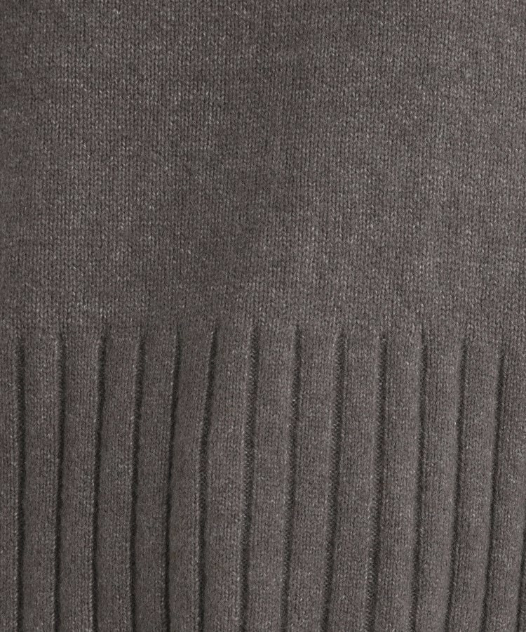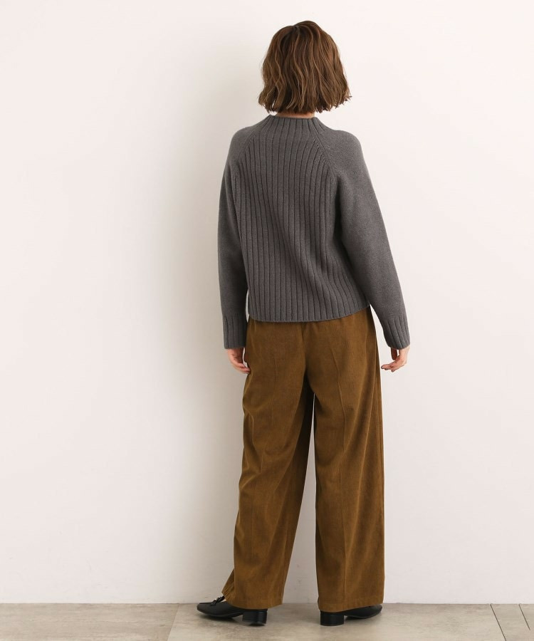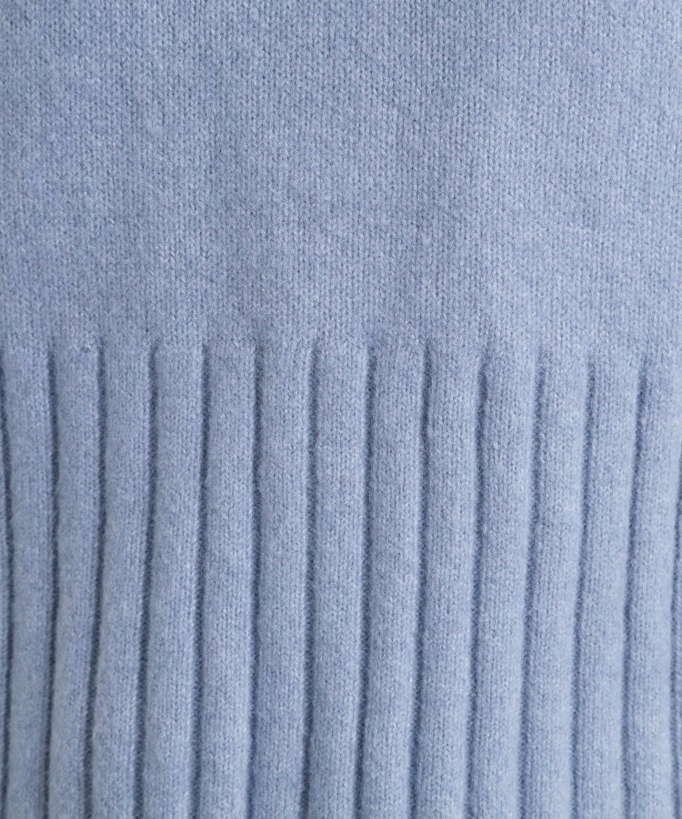 前身頃はすっきりとした天竺編み、裾と後ろ身頃にはワイドリブを取り入れ、シンプルながら編地のコントラストで存在感を演出。