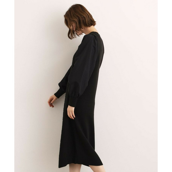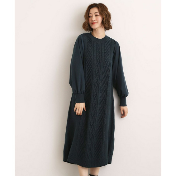 一枚で華やぐ、袖布帛ケーブルニットワンピース
