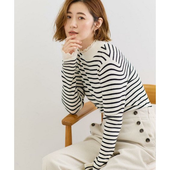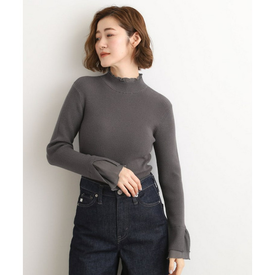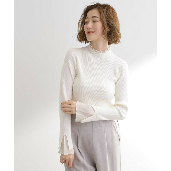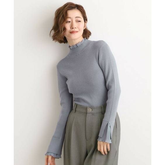 リブ編みのすっきり感と、柔らかく揺れるプリーツのコントラストが大人可愛い印象を引き立てます。