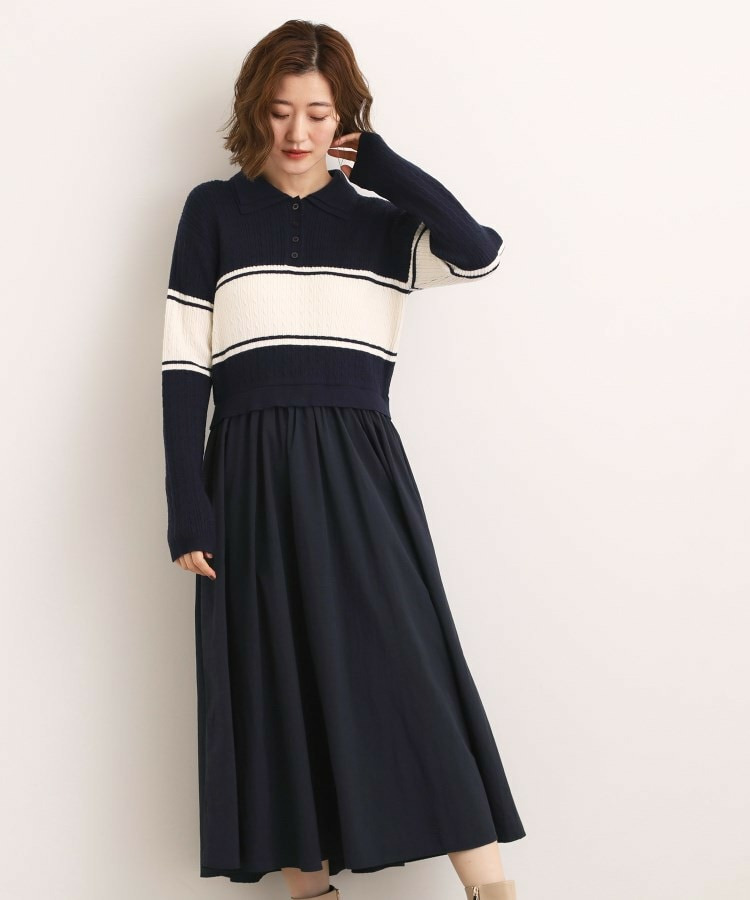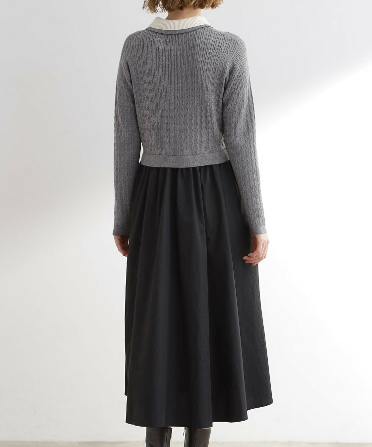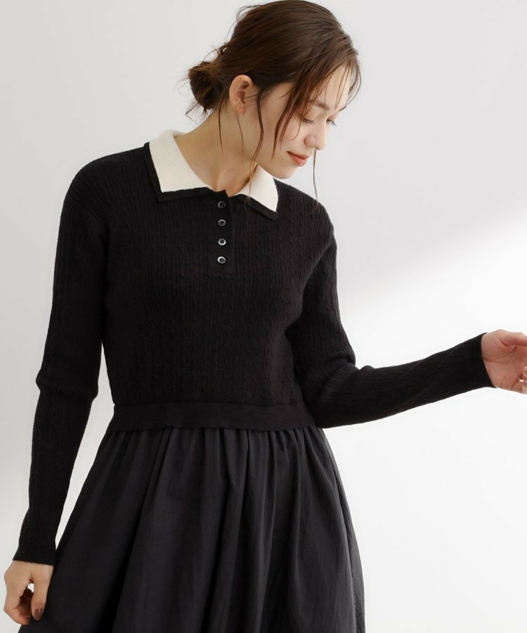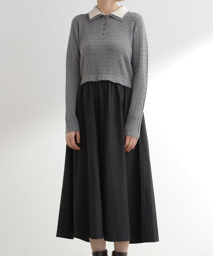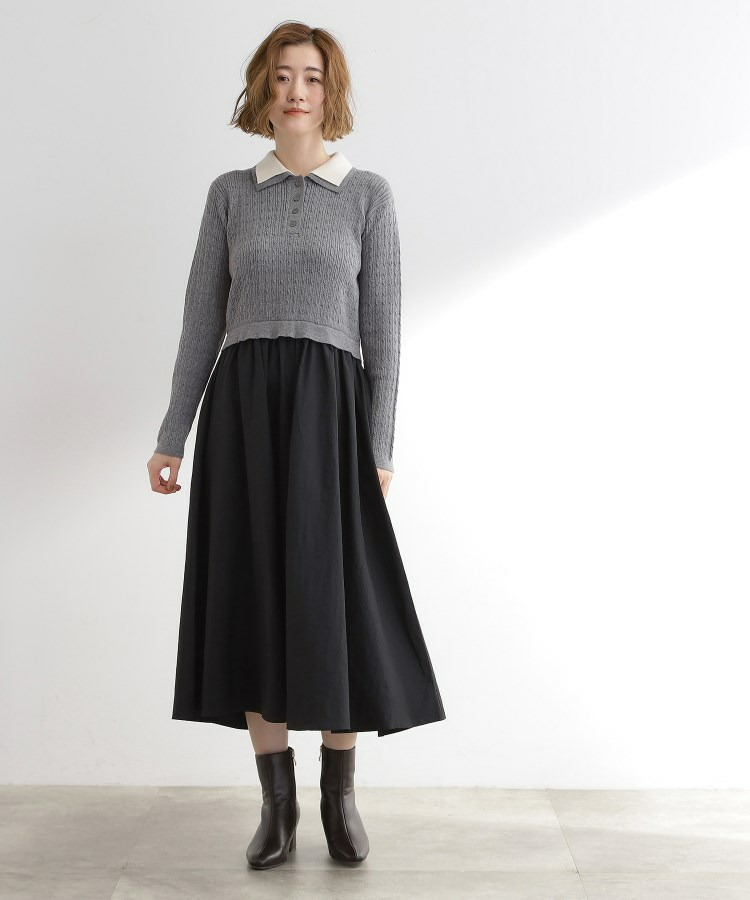 上身頃はミニケーブル編みのポロニット、スカートはたっぷり分量をとったフレアデザインをドッキングしたワンピースです。