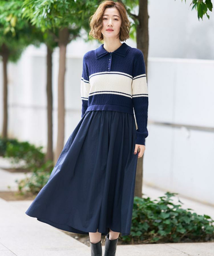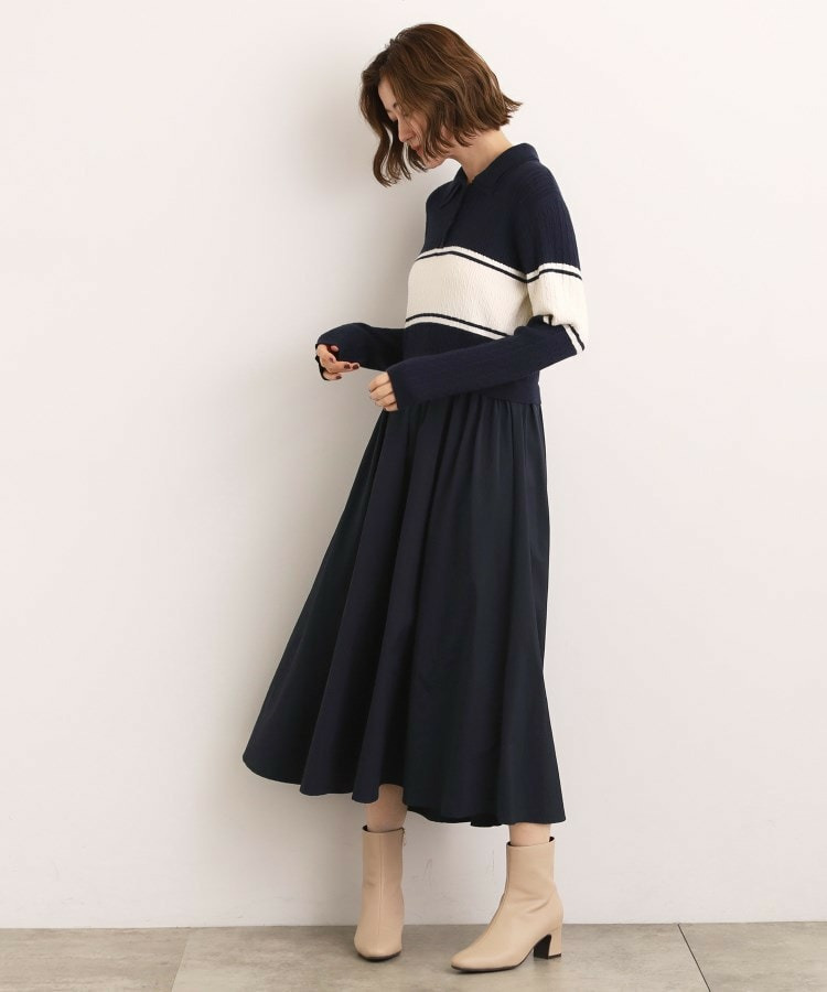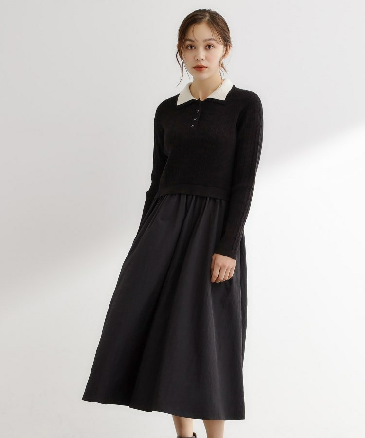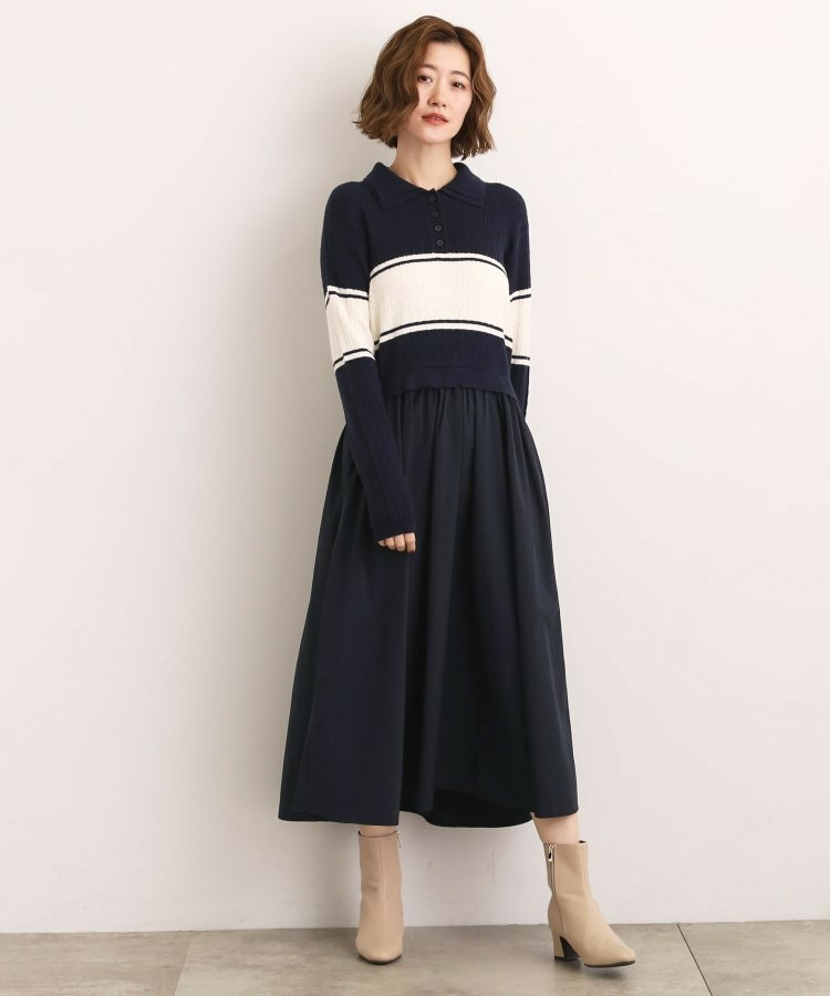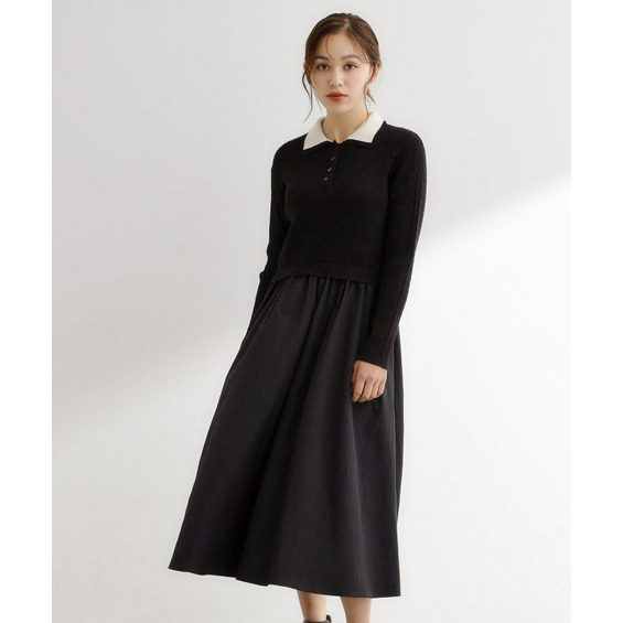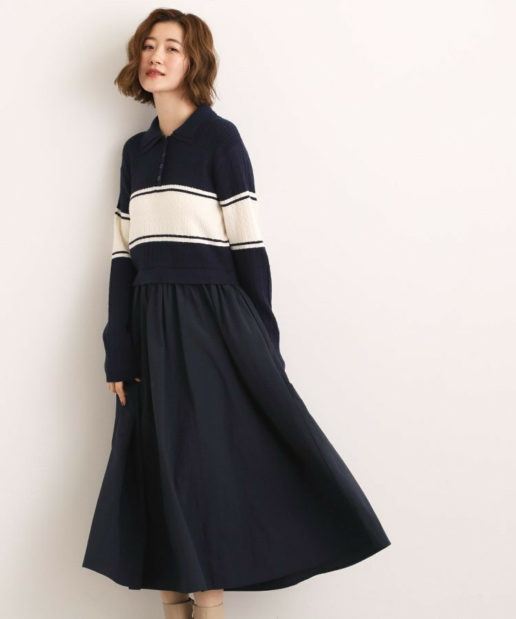 上身頃はミニケーブル編みのポロニット、スカートはたっぷり分量をとったフレアデザインをドッキングしたワンピースです。