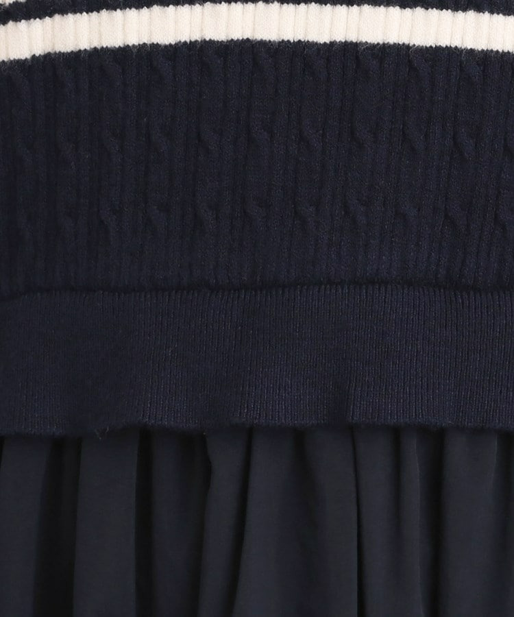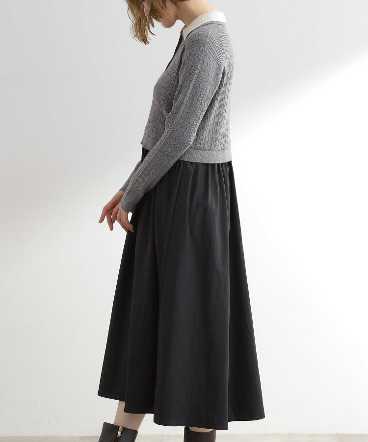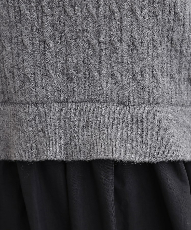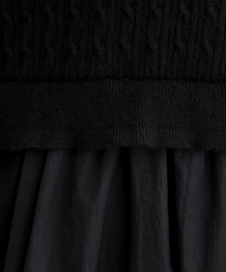 上身頃は立体感のあるミニケーブル編みニット、スカート部分は程よいハリ感を持つタフタ素材を使用。