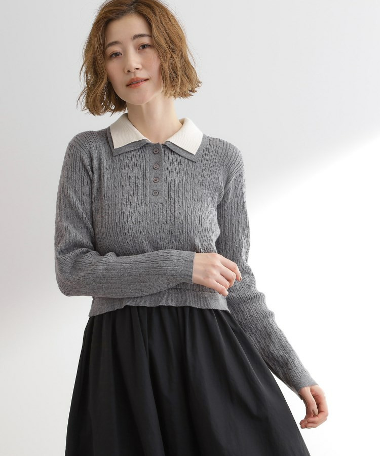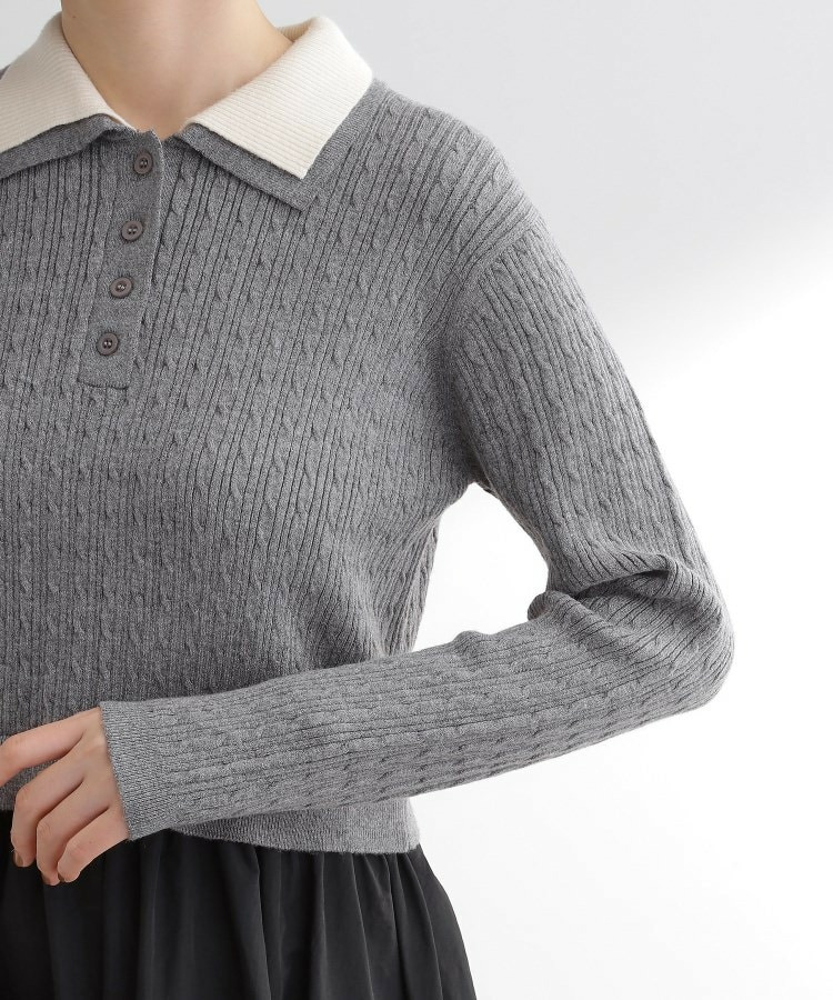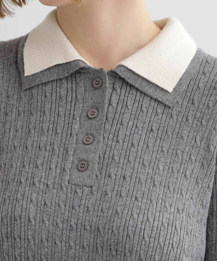 スポーティになりがちなポロデザインも、ケーブル編みとフェイクレイヤード風の2枚衿ディテールでクラシカルなムードに。